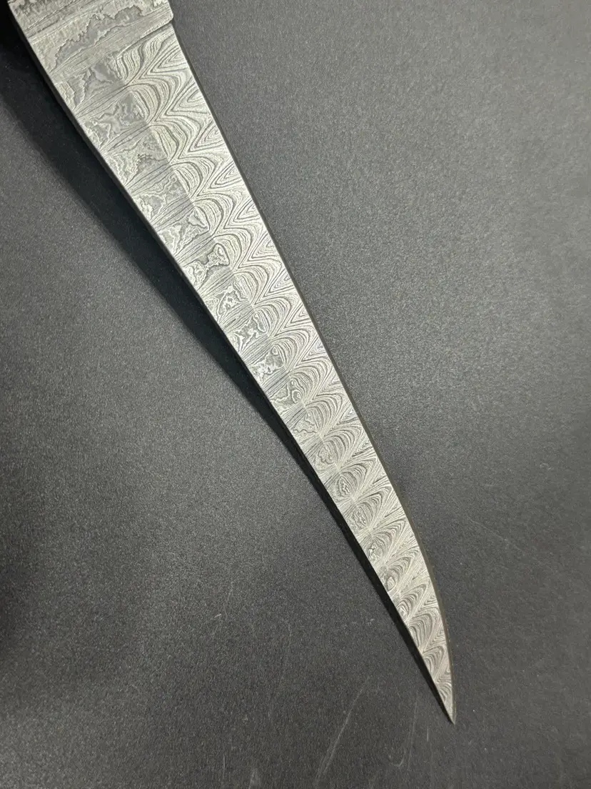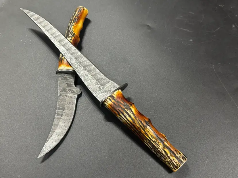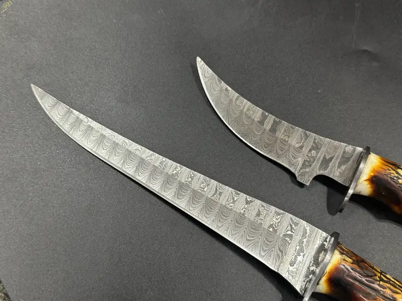 It’s great quality full custom and handmade knives (2 pcs) handle material is stag horn and Damascus steel blade. over all 13 inches and 2nd about 9 inches.
