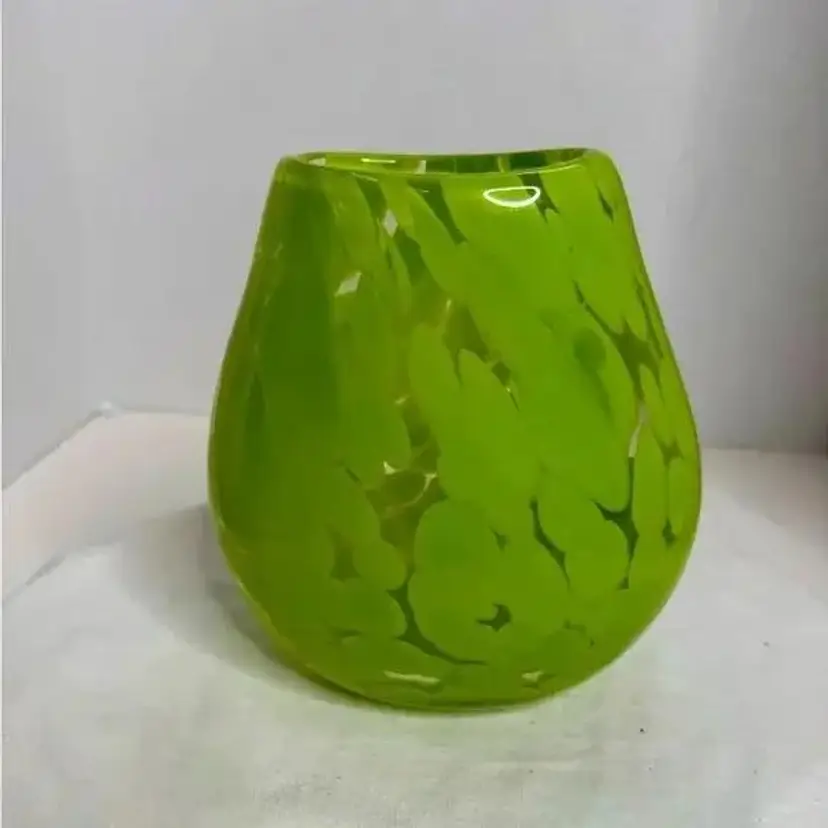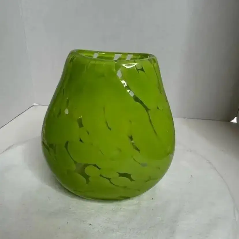 Handmade Clear/Green Art Glass Vase. Well made. Thick Glass. (A). Approximately 6.5” tall, 5.5” wide, 3.5” deep and opening is 3.5” diameter. Weighs 2 pounds. Pre-owned. Very good condition. No damage. Beautiful piece!