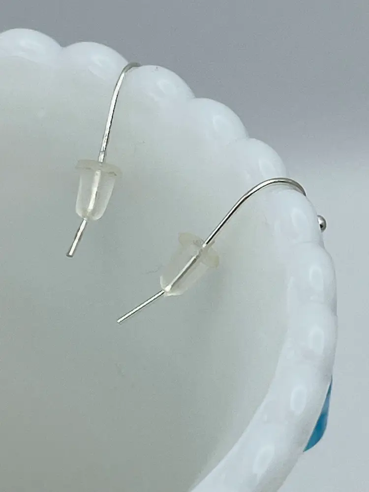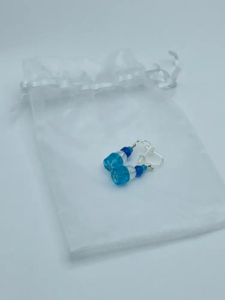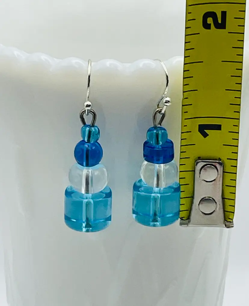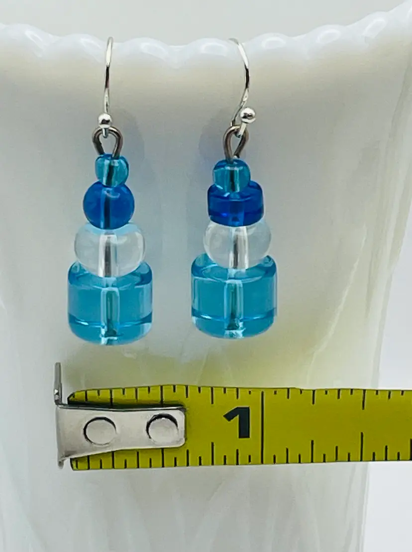 Handmade Earrings, Blue/Clear Glass Beads, Silver Tone Accents, White Drawstring Bag/Backers Included Please see pictures for measurements.