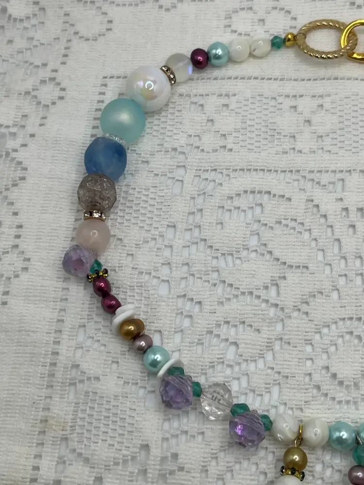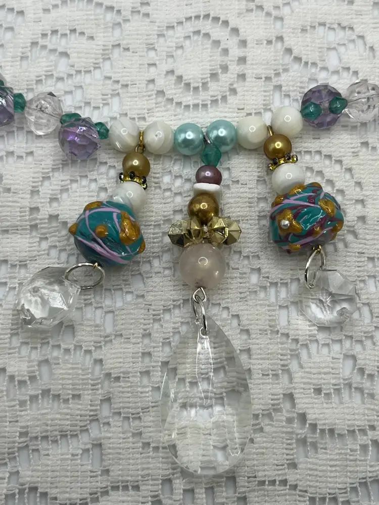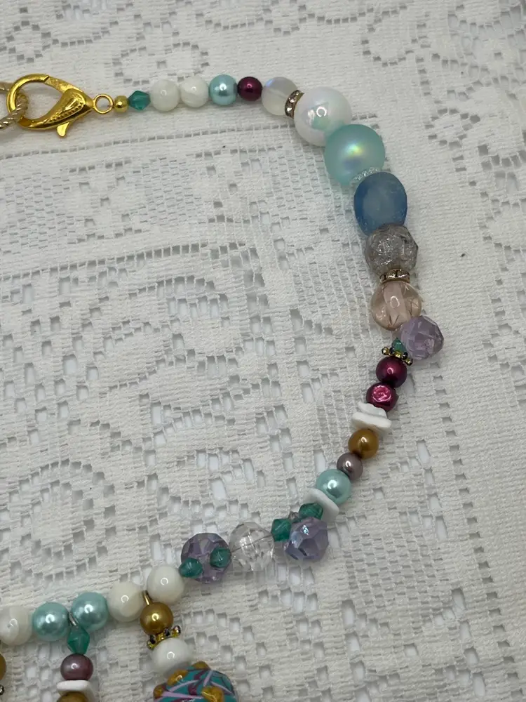 • Materials: Acrylic beads, hand-painted resin beads, fluffy pom-poms, and a statement pendant charm.