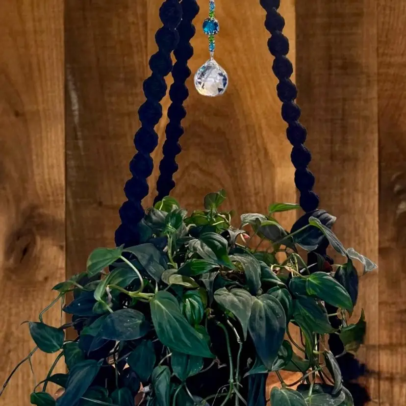 Add a bold touch to your plant corner with this handcrafted black macrame plant hanger, designed to bring texture and depth to your space. Made with thick twisted cotton cord and a solid wood base, it’s available in your choice of natural or dark stain, with or without a crystal suncatcher for a little extra shine.
