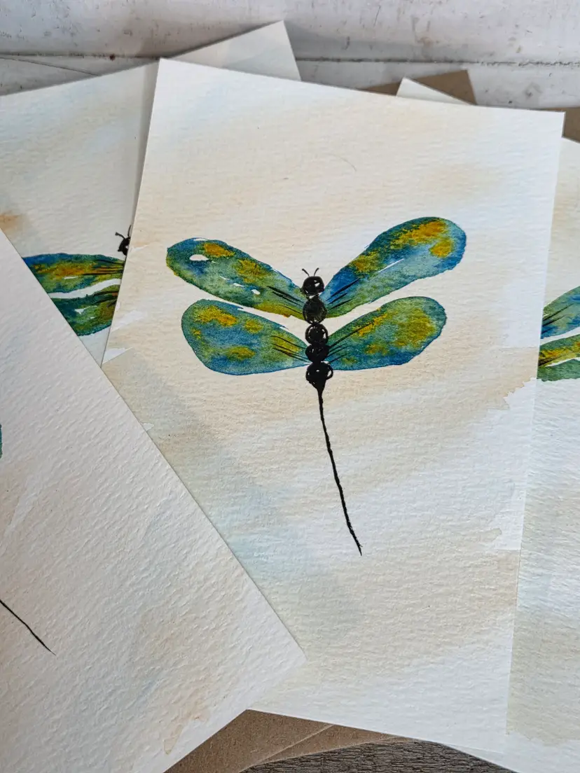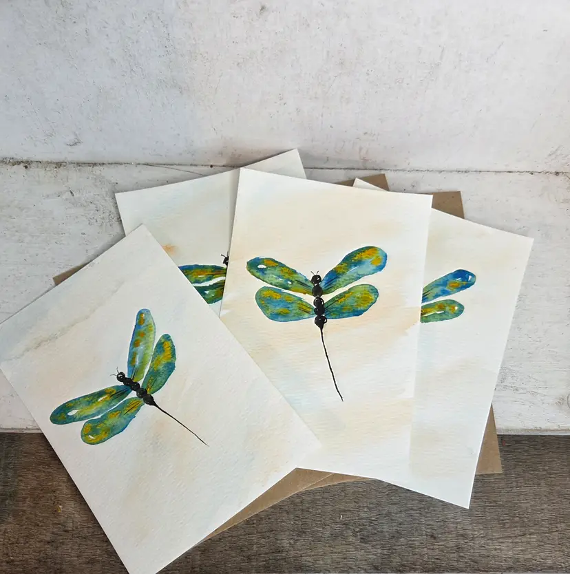 Handpainted Watercolor dragonfly cards. Set of 4. Includes four Kraft envelopes.