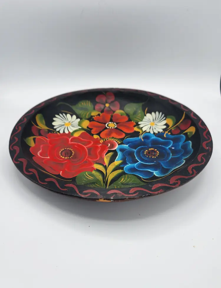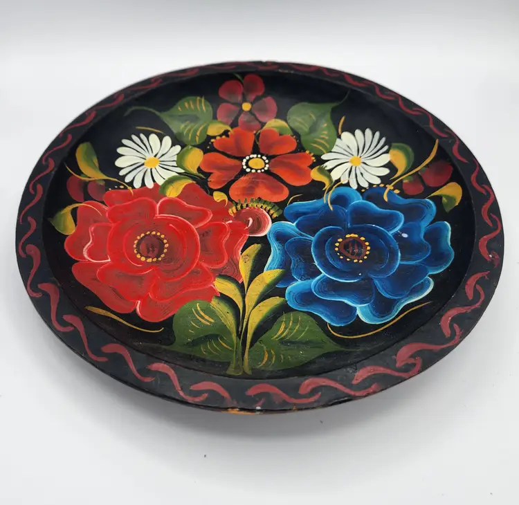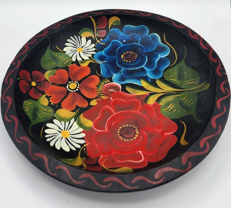 Hand-painted wooden bowl, possible a Mexican batea. Flowers glow. Small chip along the edge. 9.25" wide