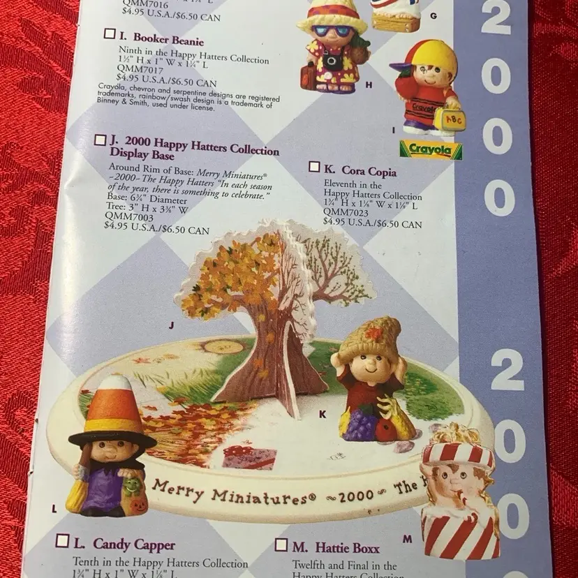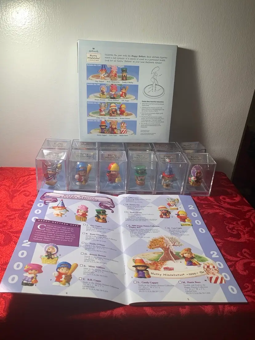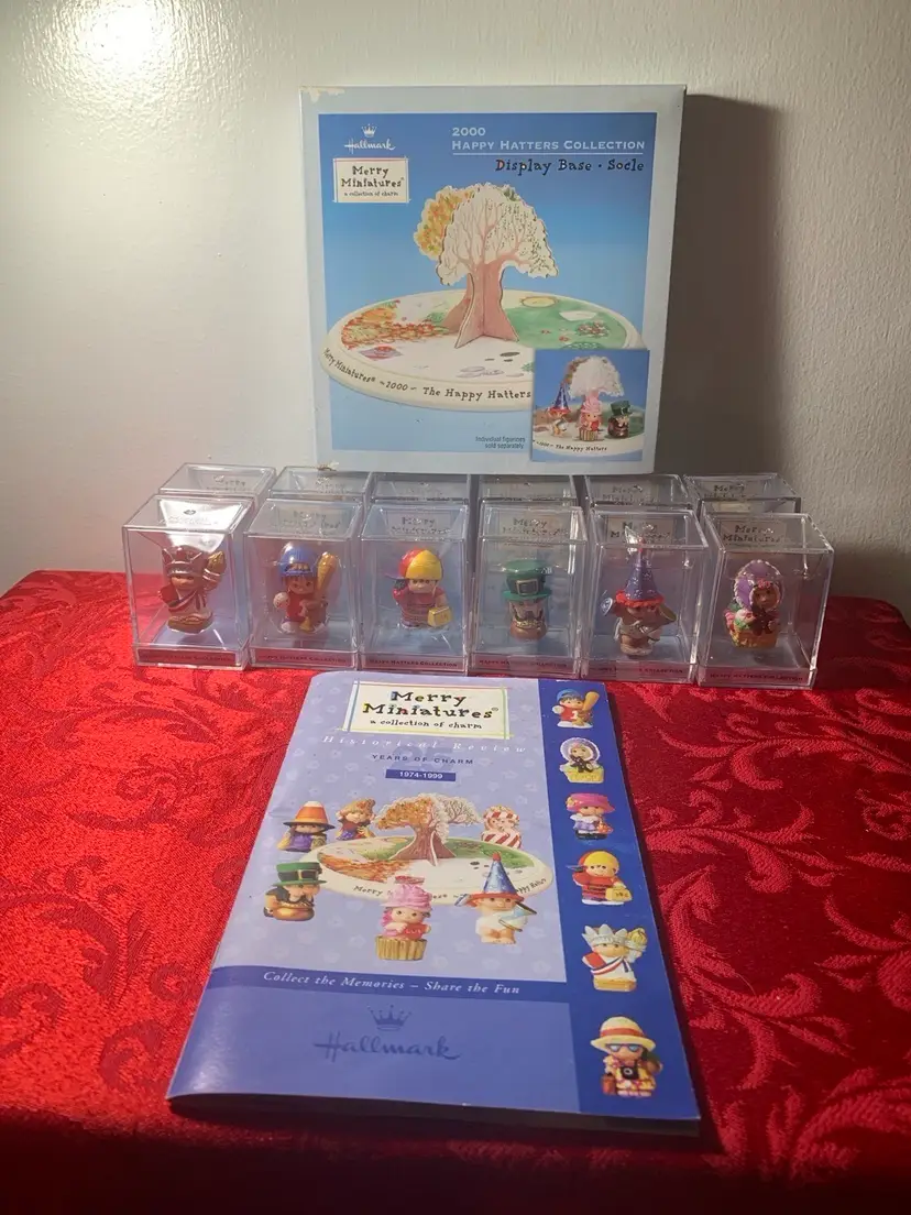 Each mini is approximately 1 1/2" to 2" in height, made of resin, and in individual boxes (H: 2 3/4" x 1 3/4"). This is the Happy Hatters 2000 Yearly Collection. Included are a Historical Review book and display base. ( Base is missing the cardboard tree).