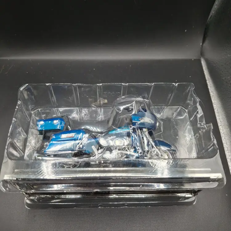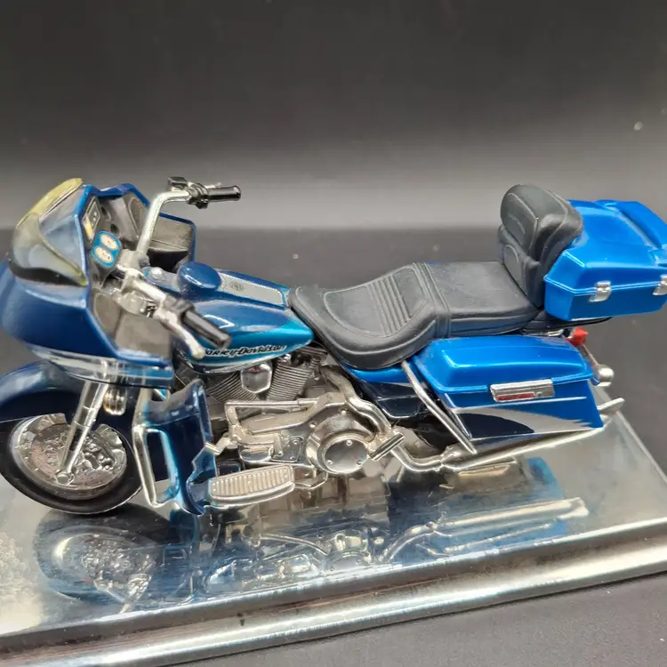 A gleaming testament to mechanical artistry sits poised on its metallic stage, a miniature marvel that whispers tales of endless highways and wind-swept journeys. This Harley-Davidson Road Glide, rendered in a mesmerizing blue that captures both sky and spirit, represents more than a mere model - it's a portal to adventure, meticulously crafted by Maisto to honor the legendary motorcycle's intricate design and soul-stirring heritage. Each delicate component tells a story of engineering passion, from its richly detailed engine to the carefully sculpted leather seat that seems to invite wandering souls to explore unknown roads.