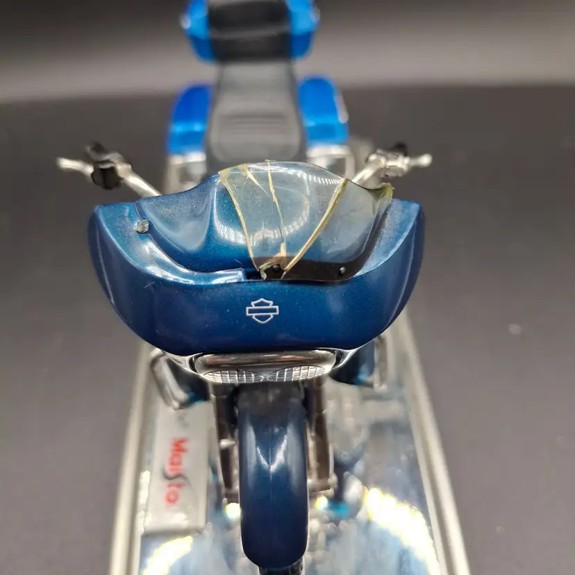 • Authentic 1:18 scale die-cast metal replica • Detailed engine and mechanical components • Functional steering mechanism • Removable saddlebags • Precision windshield and instrument panel Please see windshield in last picture - appears to be cracked