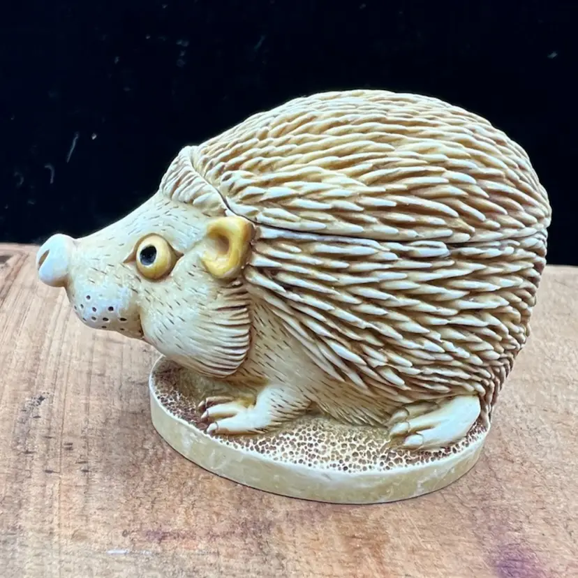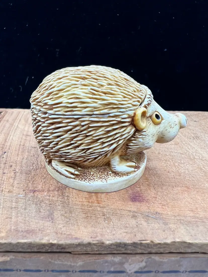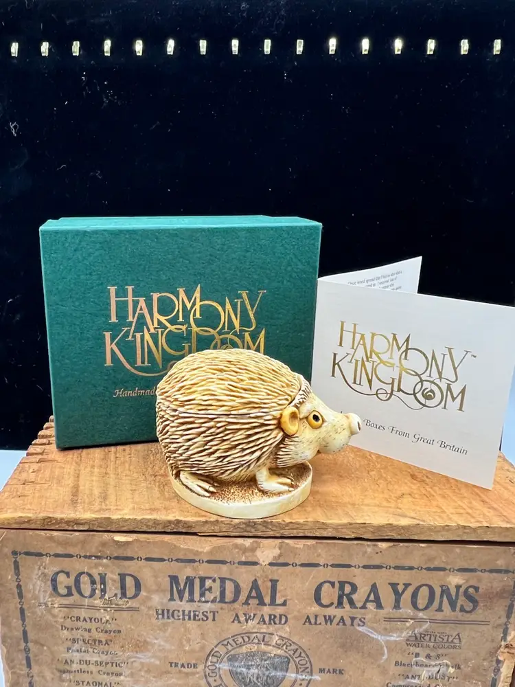HARMONY KINGDOM-TREASURE JEST “UNTOUCHABLE” HEDGEHOG FIGURINE. ONLY 1889 MADE AND IT IS ONE OF THE FIRST AND HAS NO HIDDEN MOUSE, INSCRIPTIONS OR INNER CARVINGS. IT IS MADE OF CRUSHED MARBLE AND RESIN. PETER CALVESBERT WAS THE ARTIST OF THIS DEVINE PIECE. THIS HAS THE ORIGINAL BOX AND INFORMATION CARD ABOUT THE ARTIST AND THE VILLAGE PEOPLE THAT HELP PUT ON THE COLOR AND HIGHLIGHTS. WAS CARVED IN 1994 RELEASE DATE WAS 9/1/1994 AND RETIREMENT DATE WAS 1/1/1995