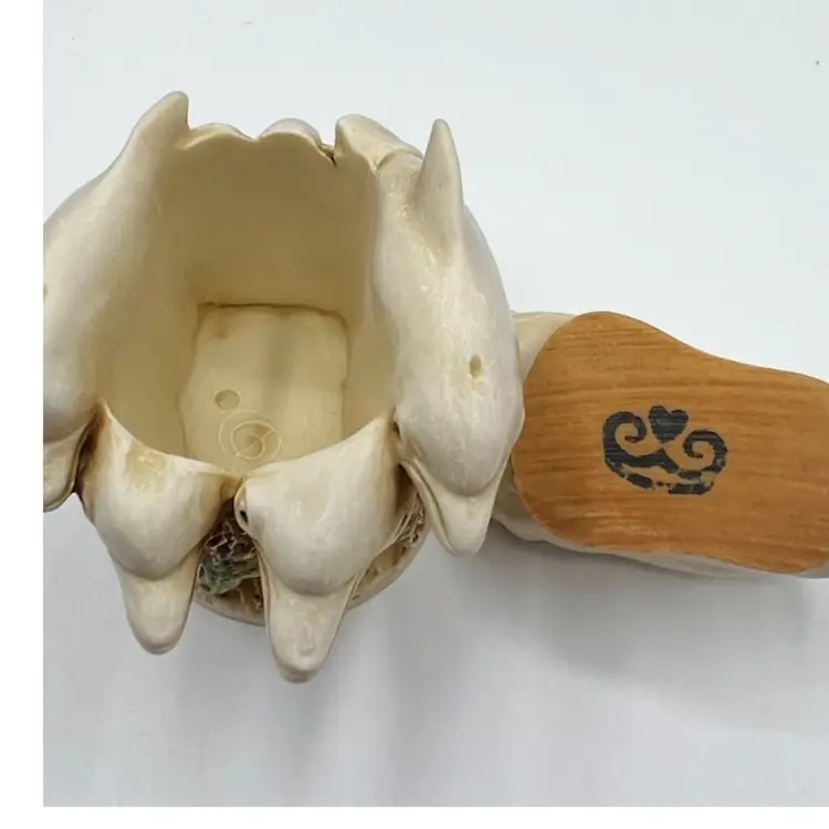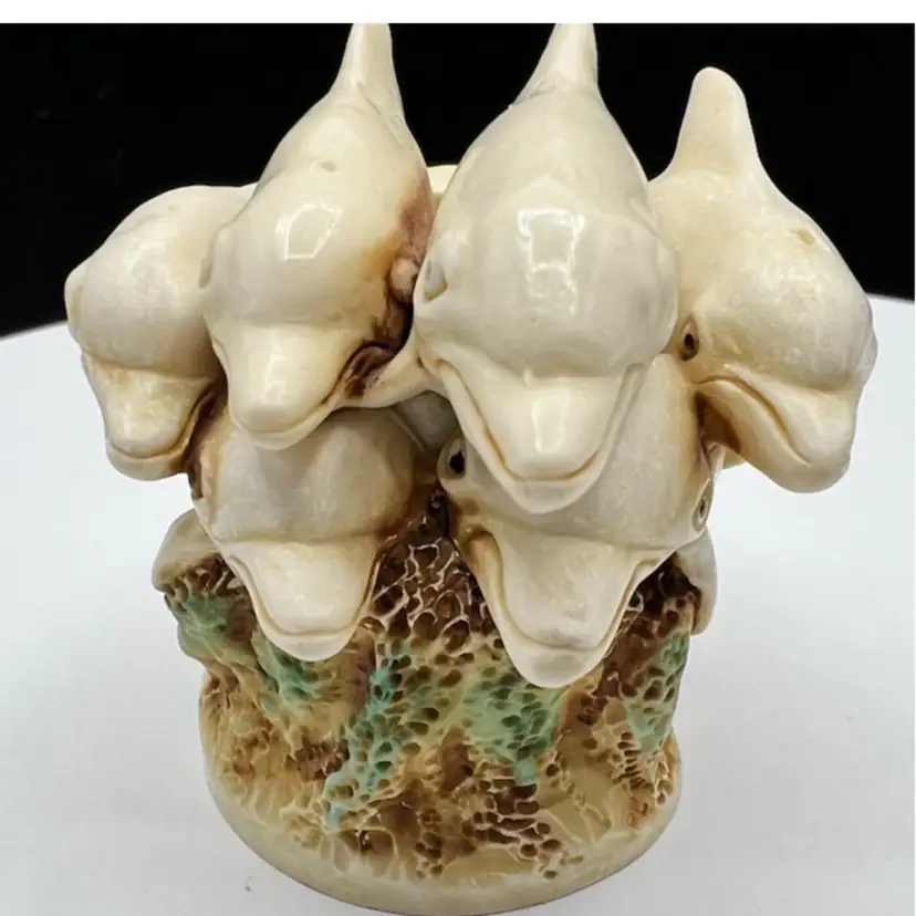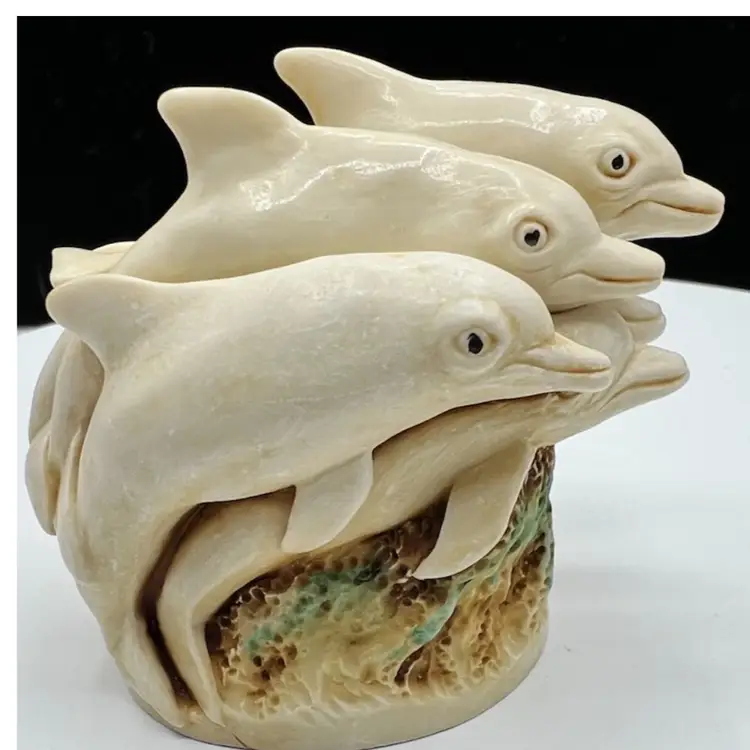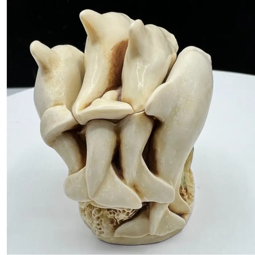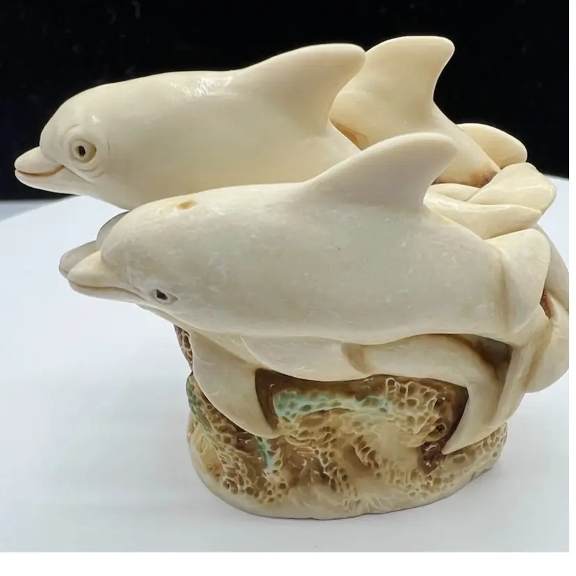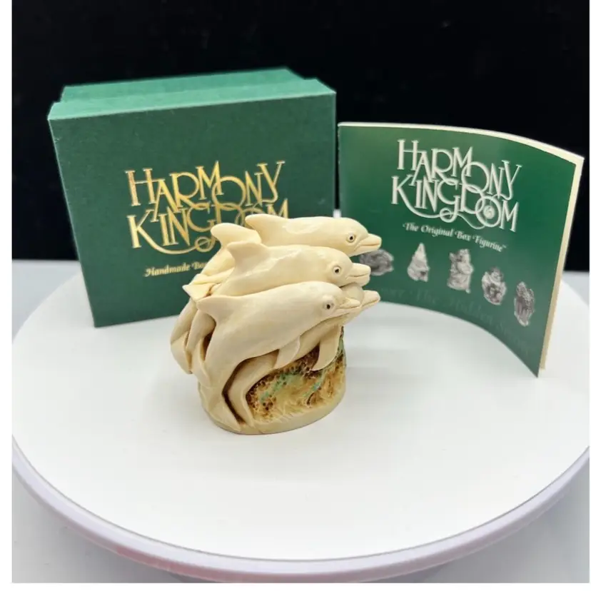 THIS IS PART OF THE TREASURE JEST COLLECTION AND THE ARTIST IS PETER CALVESBERT IT WAS RELEASED 11/1/1994 AND THEN RETIRED 4/14/2003. THERE ARE NO INSCRIPTIONS OR A HIDDEN MOUSE ON THIS SCULPTURE. HIS INSPIRATION FOR THIS WAS A FAMOUS ISRISH DOLPHIN NAMES FUNGHI IT WAS SAID THAT FUNGHI AND HIS FRIENDS LOVED TO SWIM WITH THE PEOPLE. IT IS MADE OF CRUSHED MARBLE AND RESIN IN THE UK.