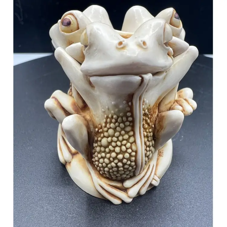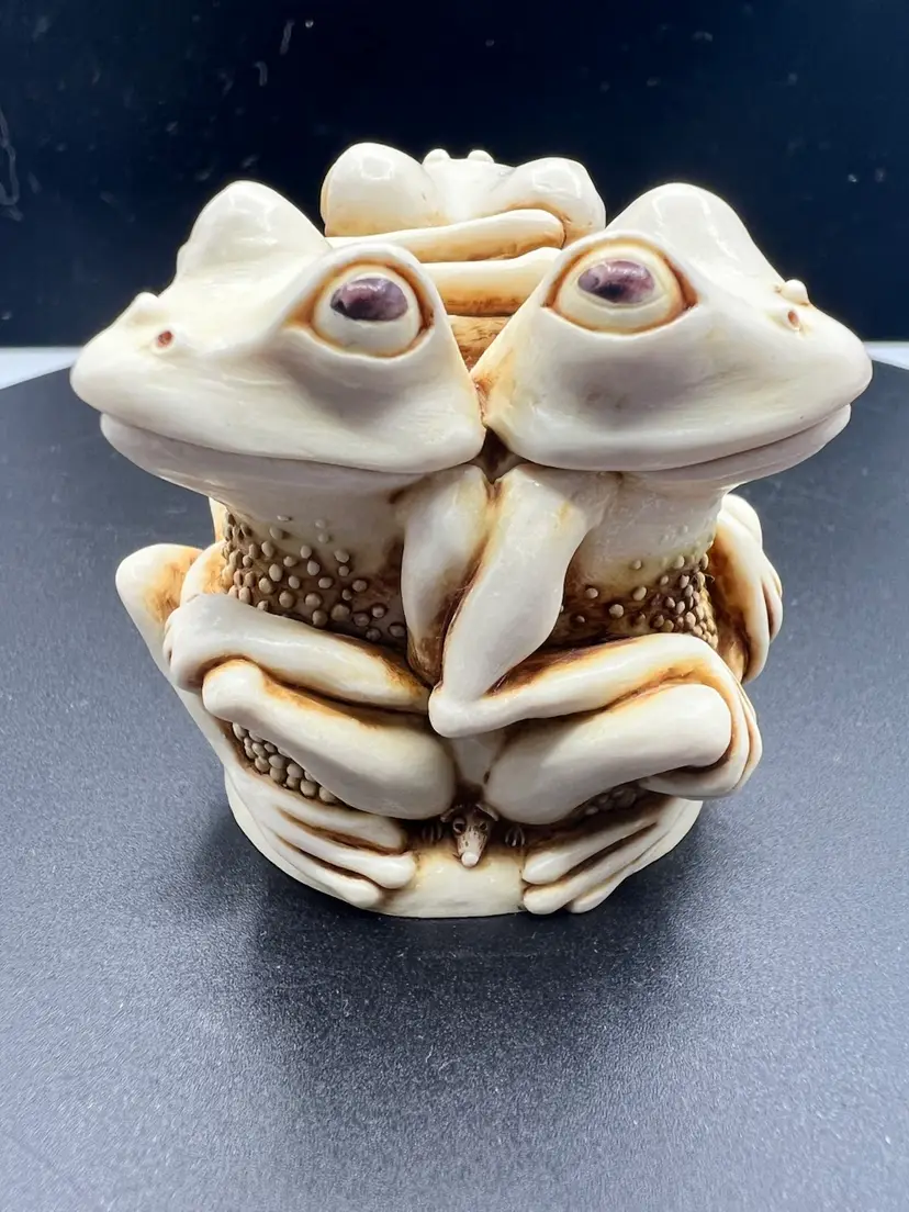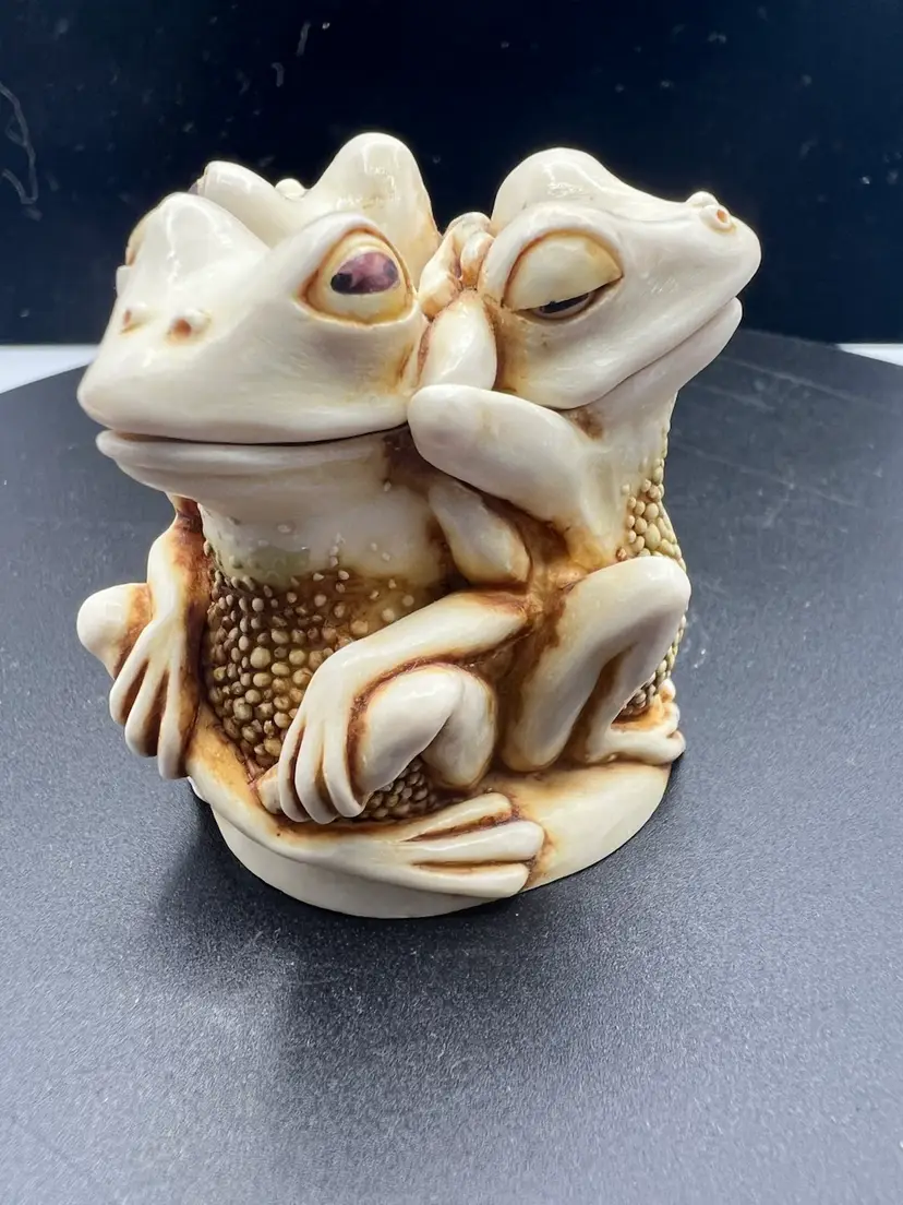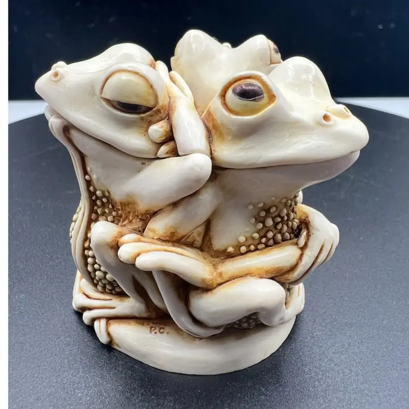 TONGUE AND CHEEK FEATURES RELAXING PLAYFUL FROGS JUST HAVING FUN TOGETHER. THE DETAILS ARE SO FANTASTIC MADE OF CRUSHED MARBLE AND RESIN CARVED BY MASTER CARVER PETER CALVESBERT. IT WAS RELEASED IN 1995 AND THEN RETIRED IN 2009. IT HAS THE HIDING MOUSE YOU CAN SEE IN THE PICTURES AND IS PART OF THE TREASURE JEST COLLECTION. IT IS PERFECT FOR HIDING LITTLE TREASURES OR JUST TO ADD SOME WHIMSY TO A ROOM. IT WAS MADE IN THE UK AND A NICE GIFT TO SOMEONE WHO LOVES FROGS.