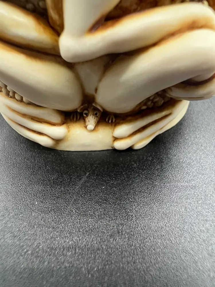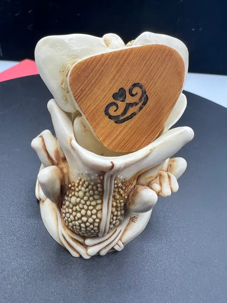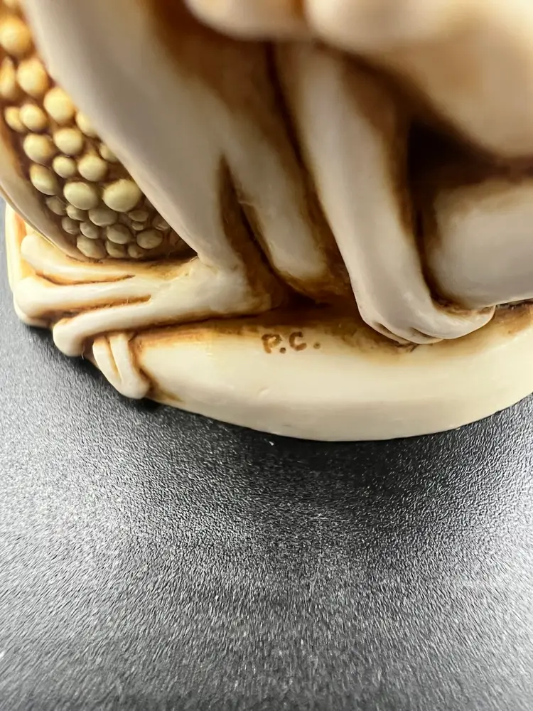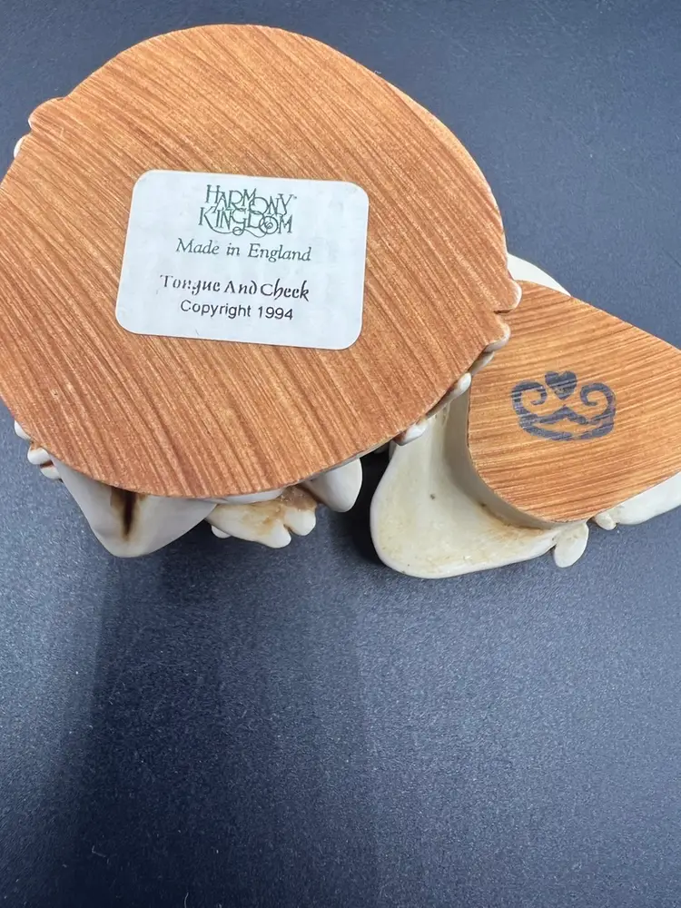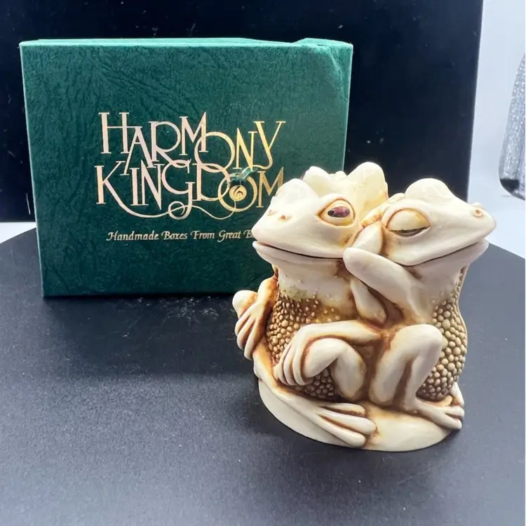 TONGUE AND CHEEK FEATURES RELAXING PLAYFUL FROGS JUST HAVING FUN TOGETHER. THE DETAILS ARE SO FANTASTIC MADE OF CRUSHED MARBLE AND RESIN CARVED BY MASTER CARVER PETER CALVESBERT. IT WAS RELEASED IN 1995 AND THEN RETIRED IN 2009. IT HAS THE HIDING MOUSE YOU CAN SEE IN THE PICTURES AND IS PART OF THE TREASURE JEST COLLECTION. IT IS PERFECT FOR HIDING LITTLE TREASURES OR JUST TO ADD SOME WHIMSY TO A ROOM. IT WAS MADE IN THE UK AND A NICE GIFT TO SOMEONE WHO LOVES FROGS.