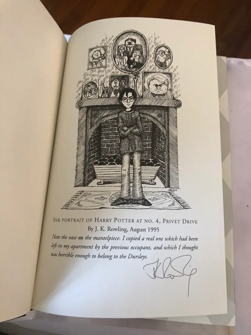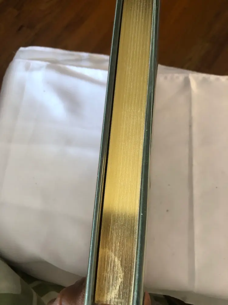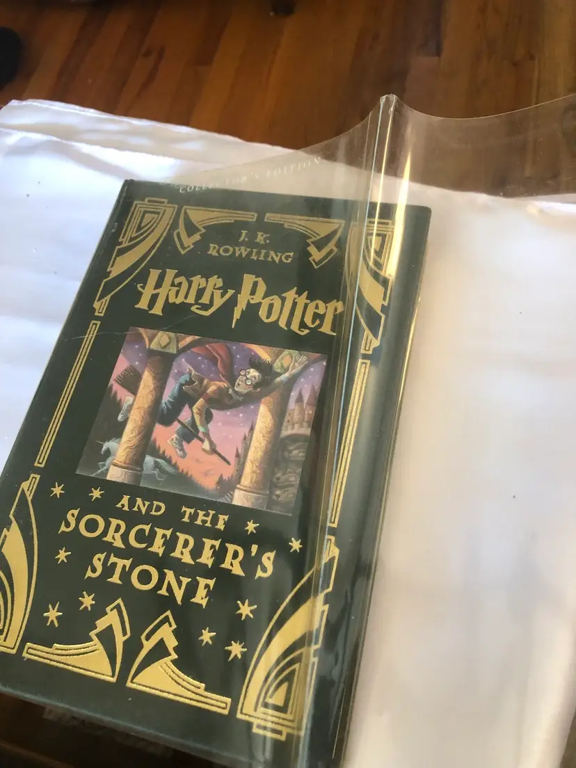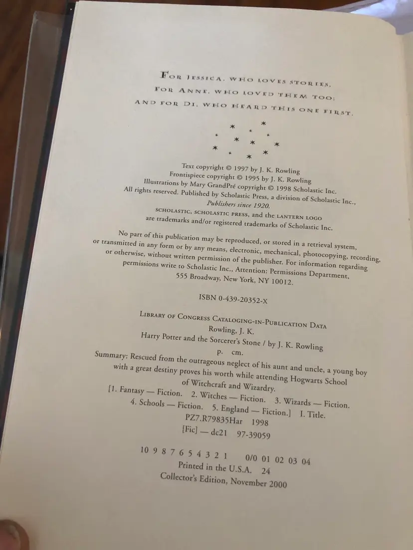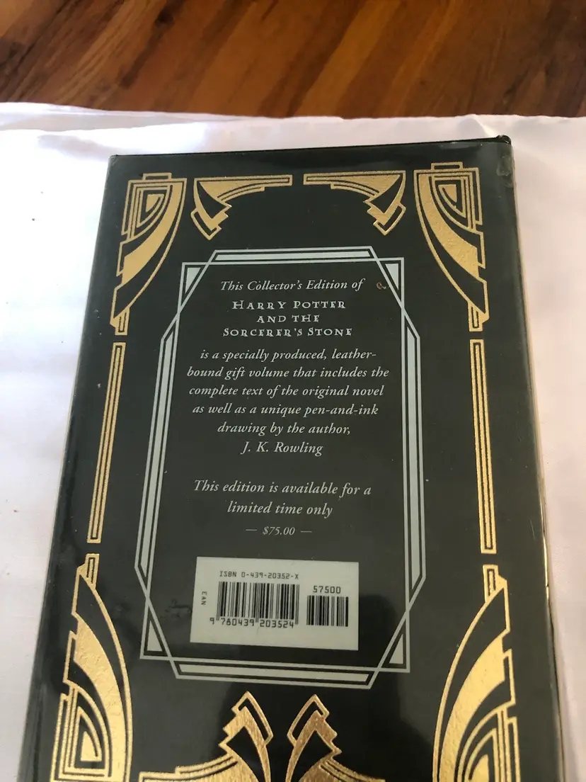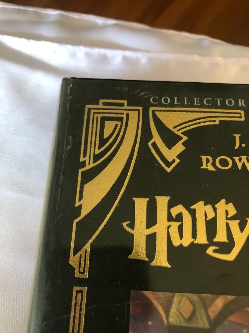 Hardback 2000 Collector’s Edition Of “Harry Potter And The Sorcerer’s Stone” By J. K. Rowling, Gold Lined Pages, Book is in overall good condition but the corner is a little messed up. Plastic sleeve is a little yellow, but pages are still white Please see all photos