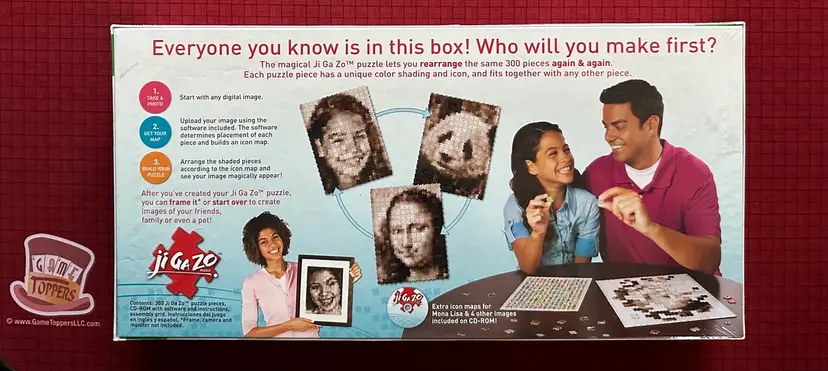 Ji Ga Zo is revolutionizing the puzzle category! This awesome puzzle has 300 pieces that you arrange to create any face — even your own! Start out with any digital image and upload it using the Ji Ga Zo software. The software figures out the placement of each piece and builds a unique icon map. Then, it’s up to you to arrange the pieces according to the icon map and watch your own special image come together! These 300 pieces are specially created with unique colors and shading that let them interlock to create almost any face image you upload. The possibilities are virtually endless and the “face-making” fun goes on and on! CD-ROM includes icon maps for Mona Lisa, a collie dog, a kitten, a panda bear and MR MONOPOLY.