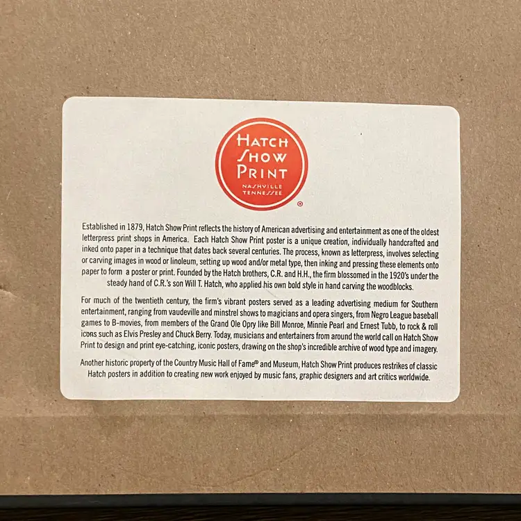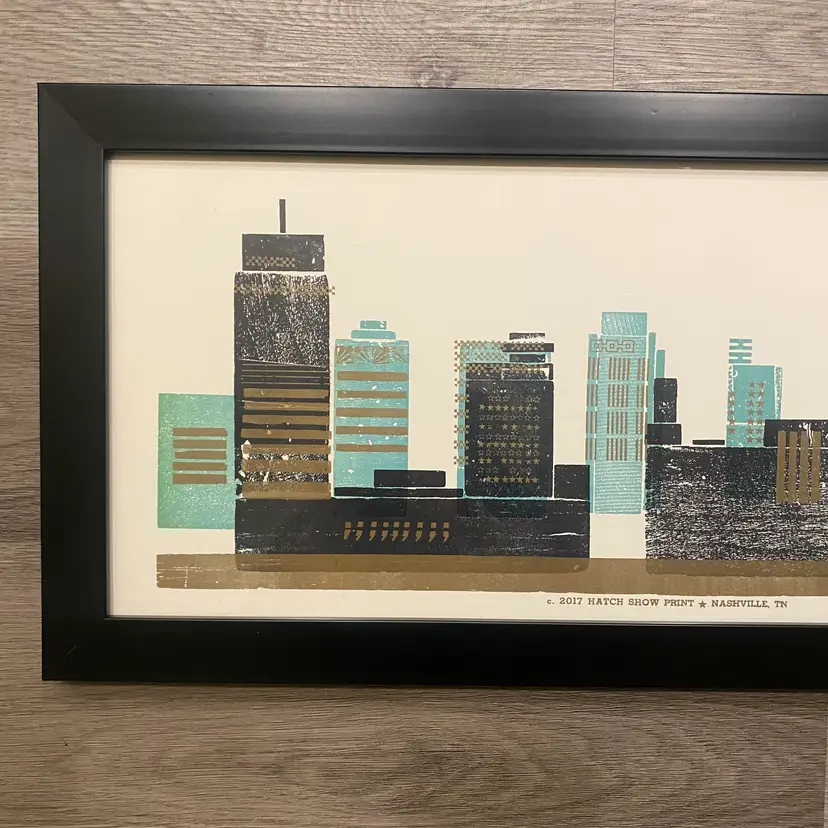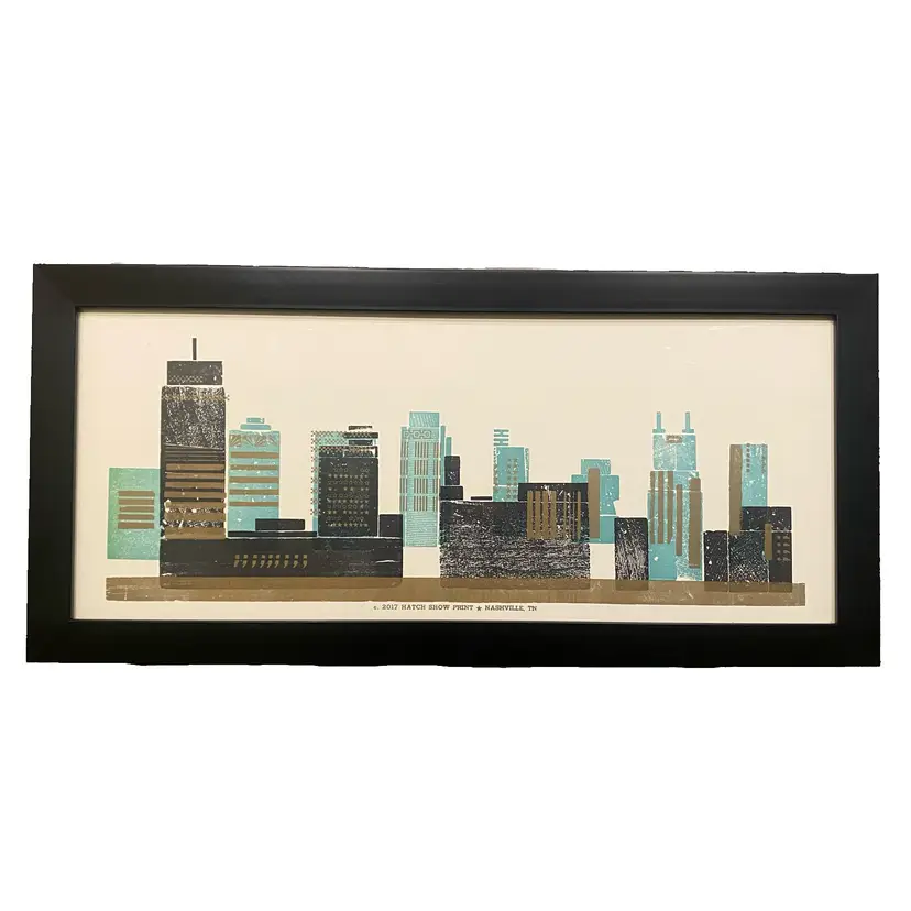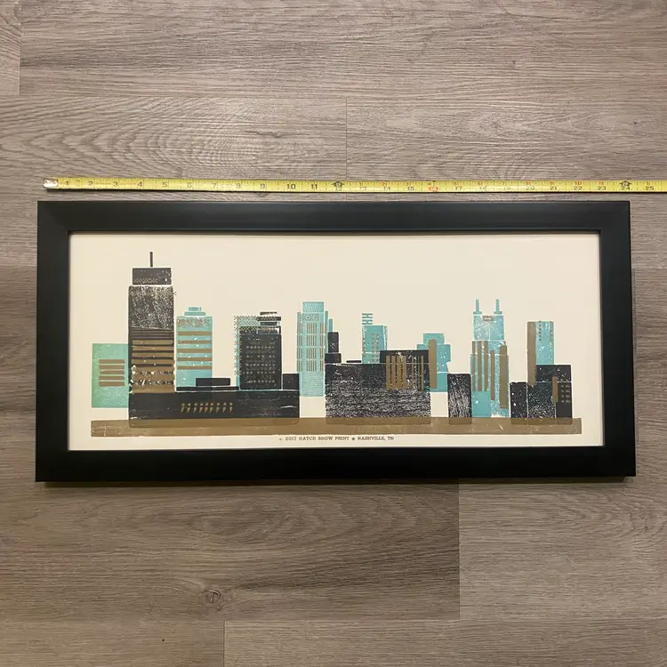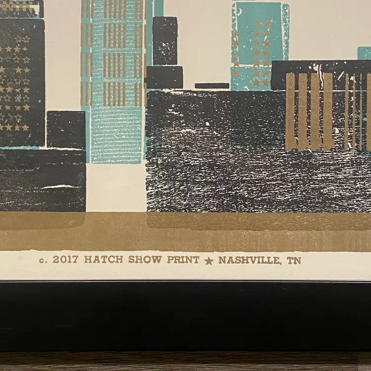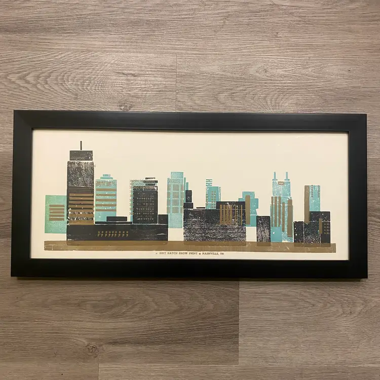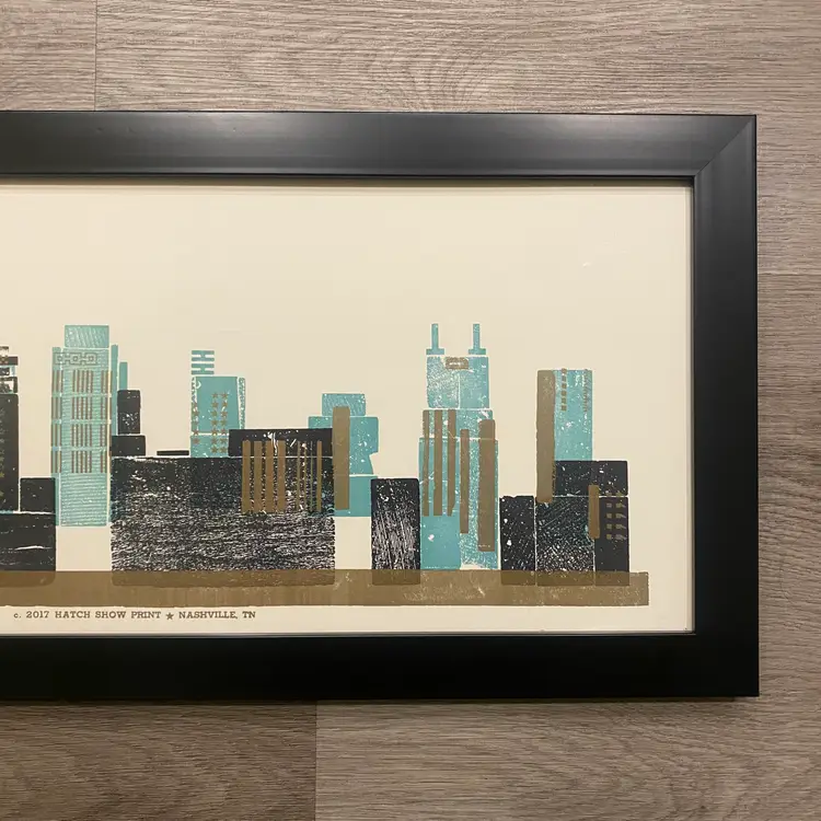 Framed letterpress print from The Hatch Show Nashville, TN, featuring the Nashville skyline.