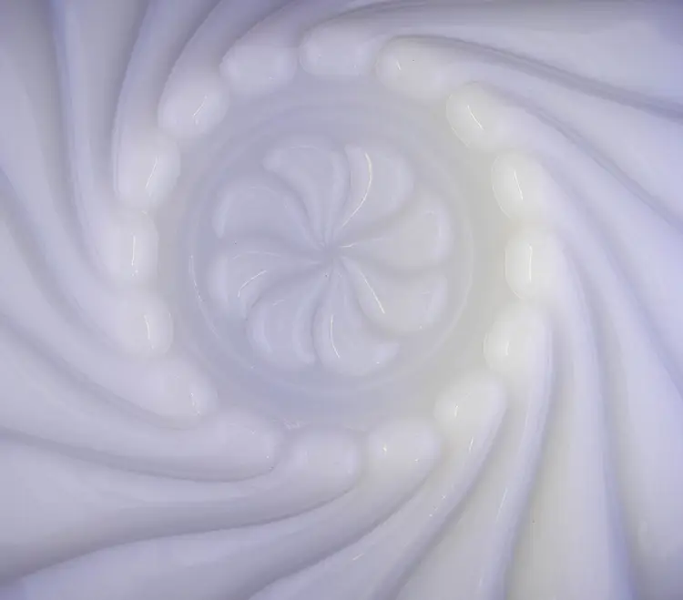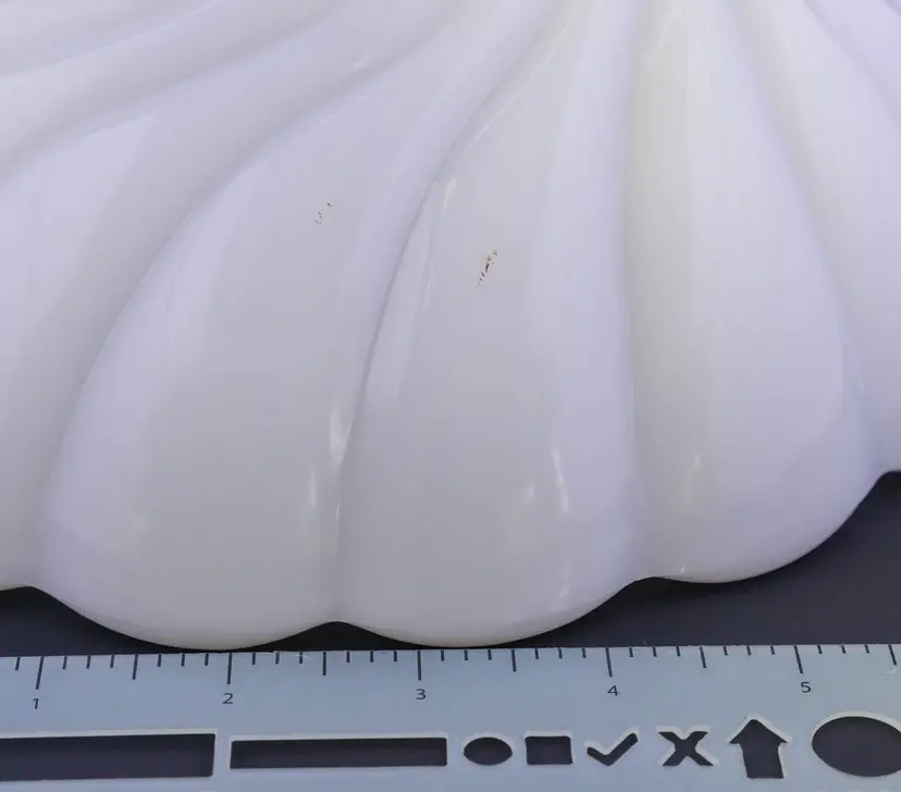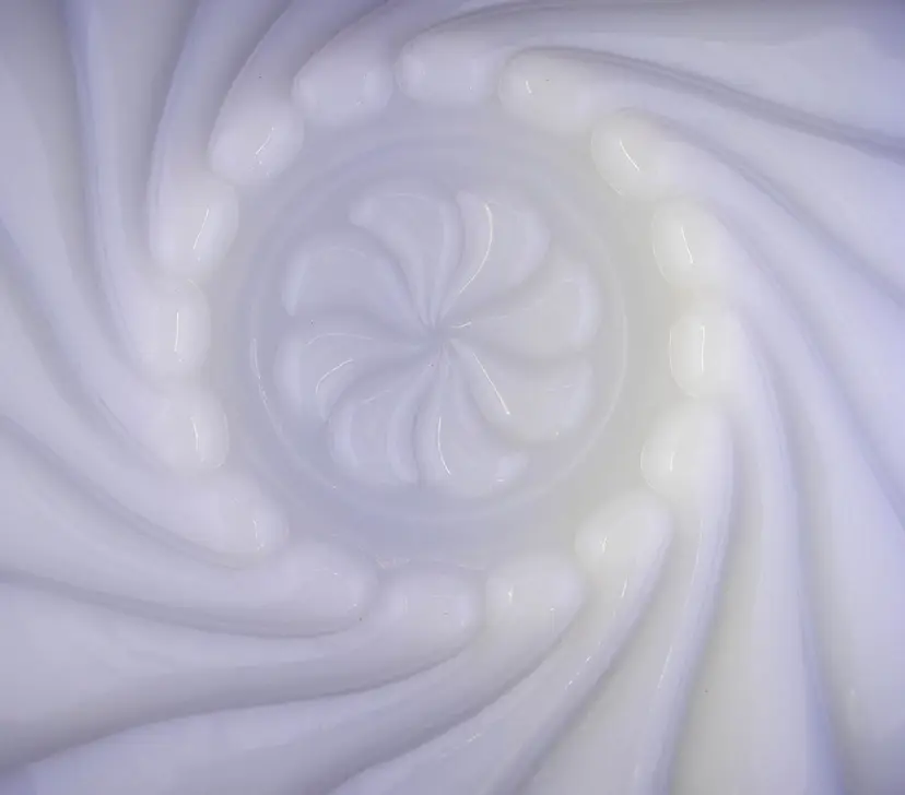 A large, 9" round serving bowl made of white milk glass with a scalloped rim. The exterior features a swirled pattern. There is a small scuff mark on one side that may come off. The bottom has a smaller version of the Alpine pattern that looks flower like. In good condition with no chips or cracks.