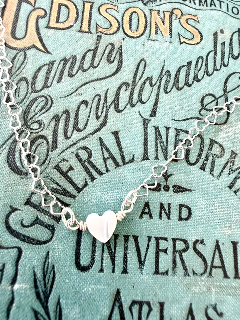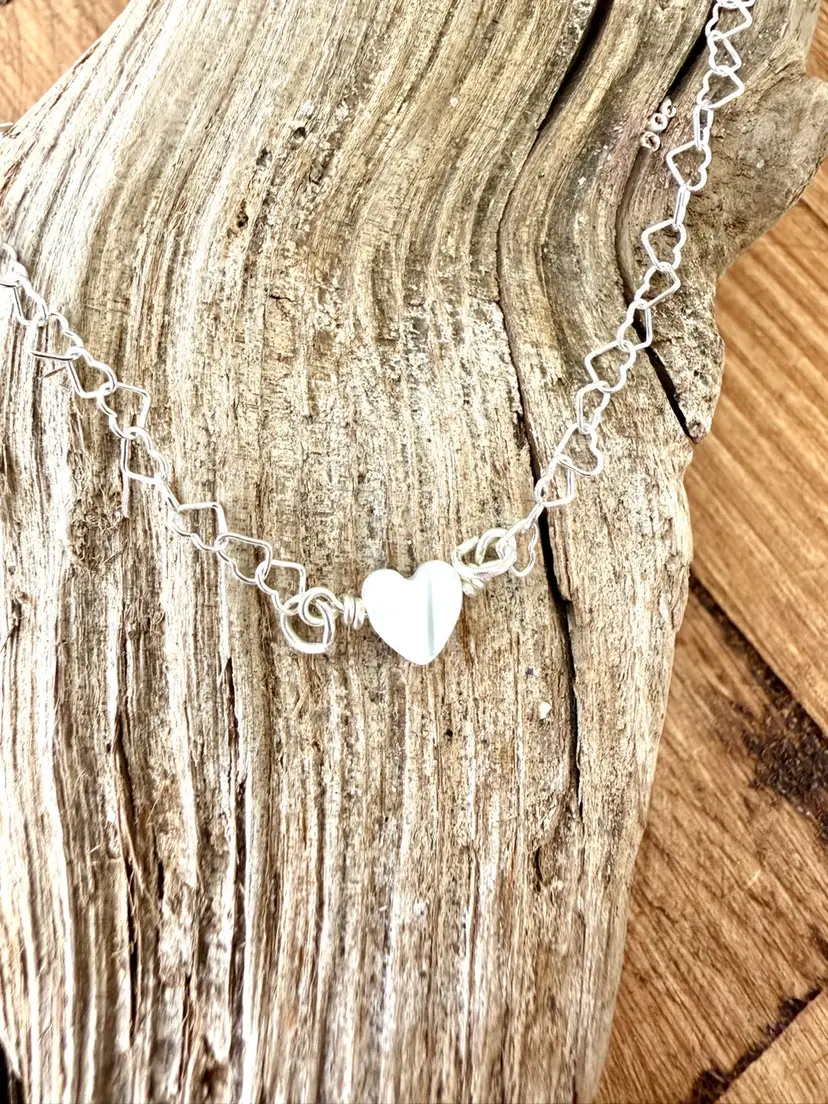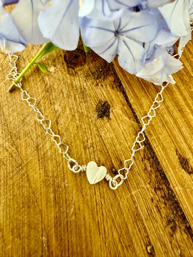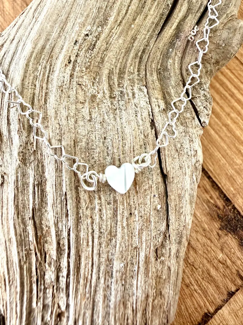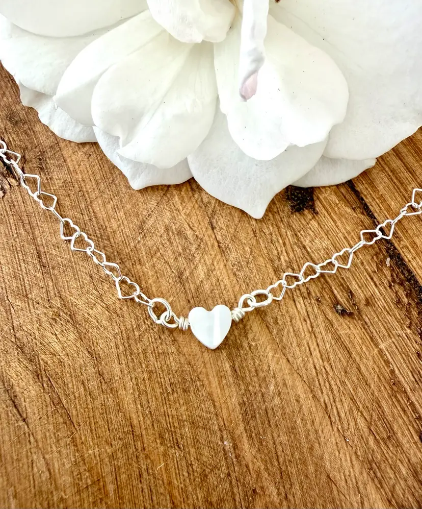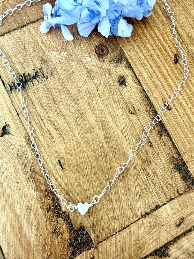 16” dainty heart shape link necklace chain 1/4” heat shape pearl wire wrapped to chain All Sterling in silver and not silver plated
