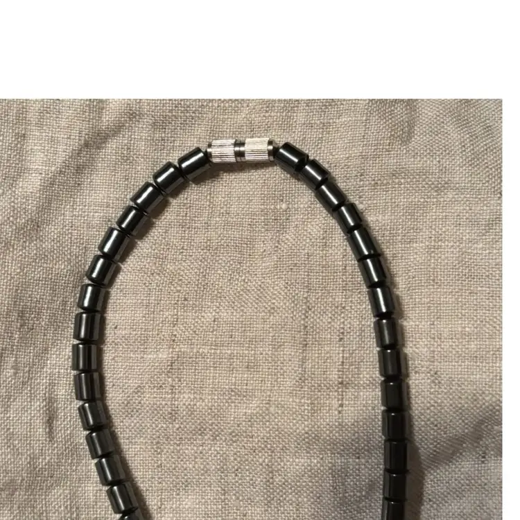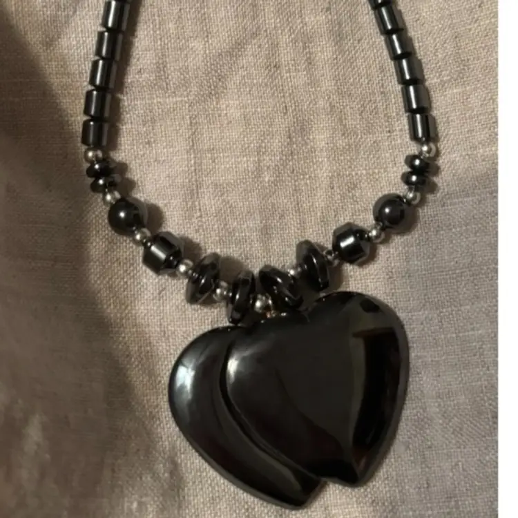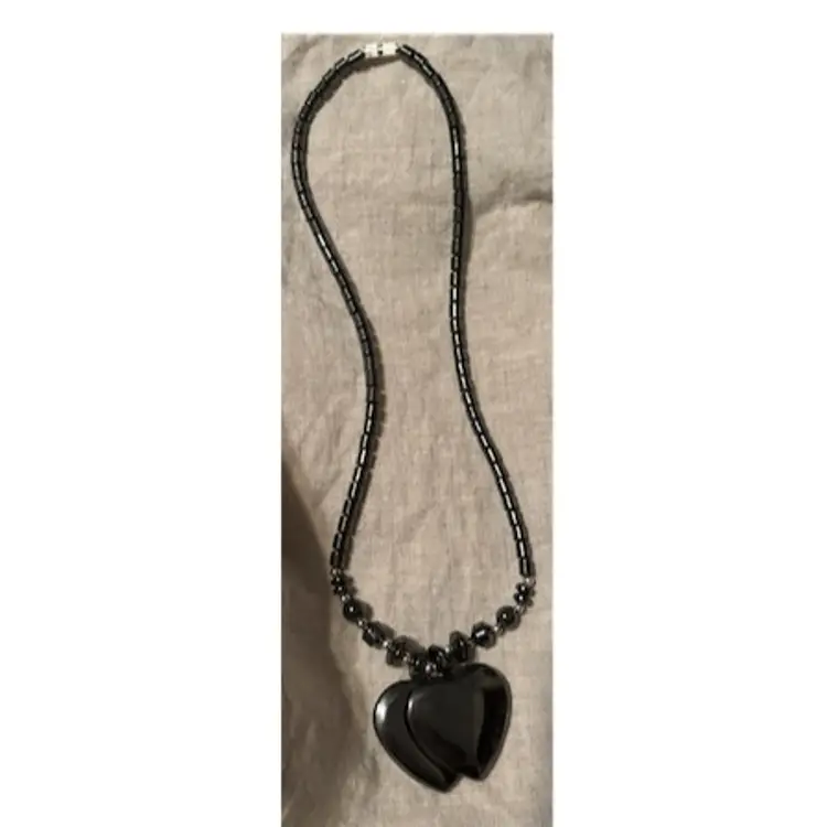 Black beaded hematite heart necklace with a barrel clasp perfect for a night out or every day wear! 16” long.