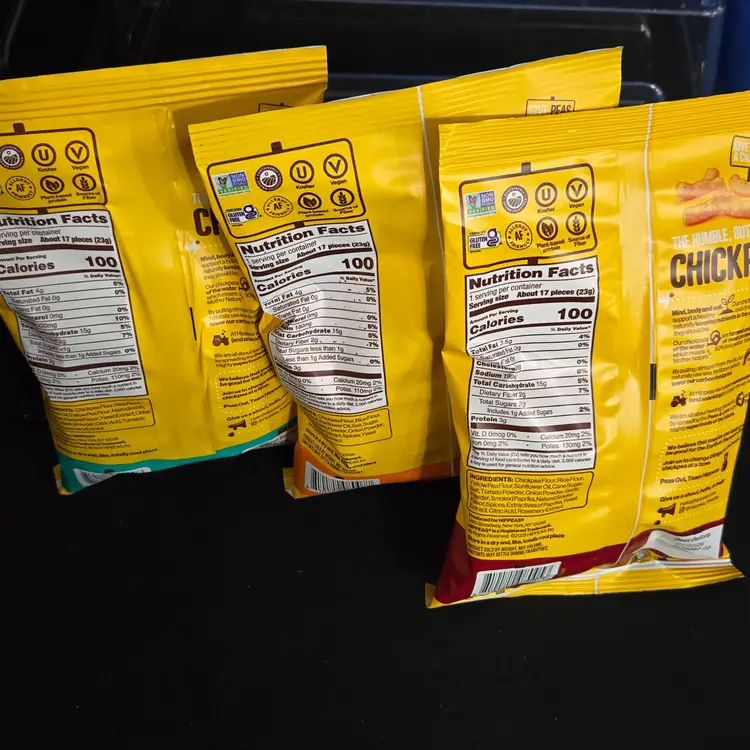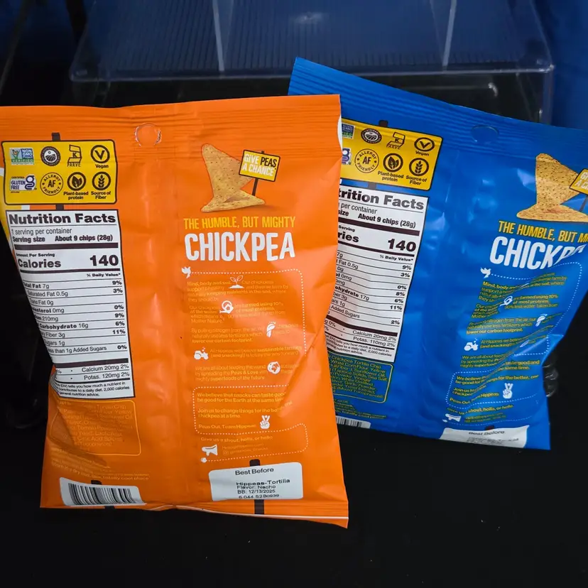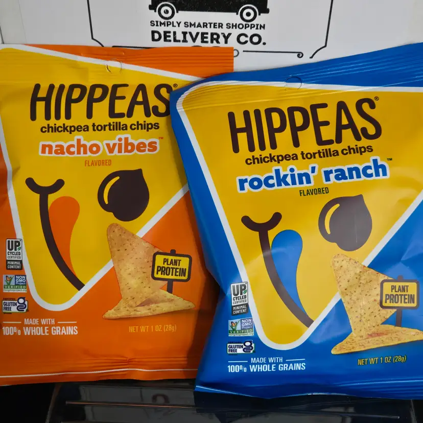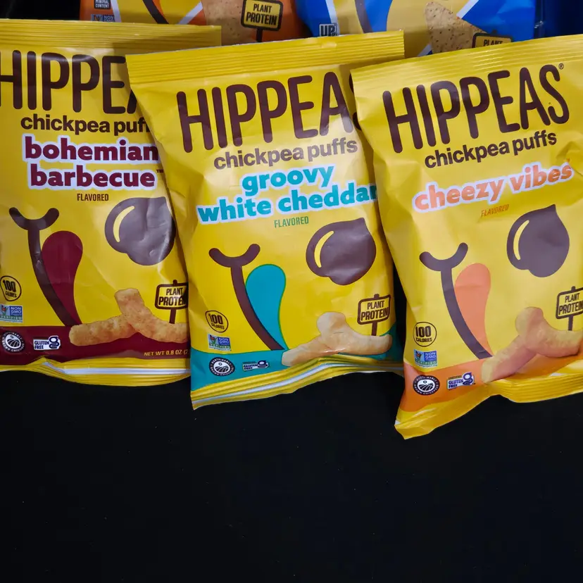 HIPPEAS Puffs & Chips Snack Size Variety 5 bags (bohemian bbq, groovy white cheddar, cheezy vibes)puffs .08oz each. (rockin' ranch, nacho vibes)chips 1oz each. In a giftable Snack Box.