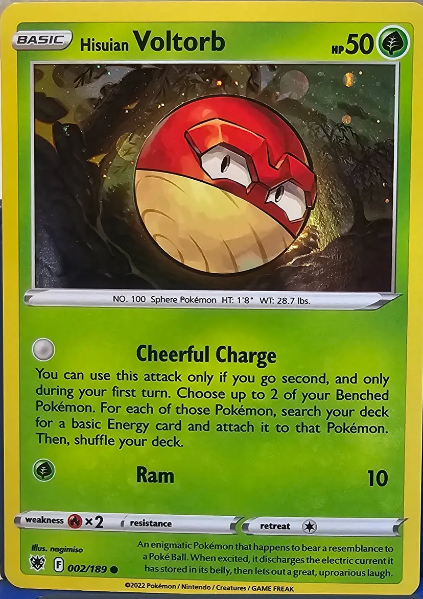 The Hisuian Voltorb Cosmos Holo 002/189 Deck Exclusives Pokemon card is a sought-after collectible within the Pokémon TCG community. Manufactured by The Pokémon Company in 2022, this standard-sized card features the Grass attribute, with an HP of 50. Illustrated by nagimiso, this exclusive promo card is part of the Deck Exclusives set, making it a rare find for collectors. The Cosmos Holo finish adds a captivating touch to the card, making it a valuable addition to any Pokémon card collection. Near mint condition.