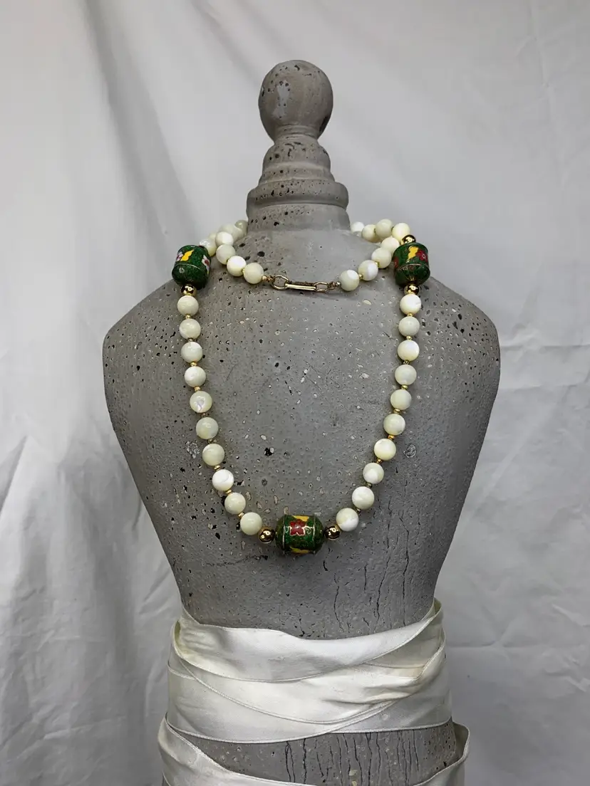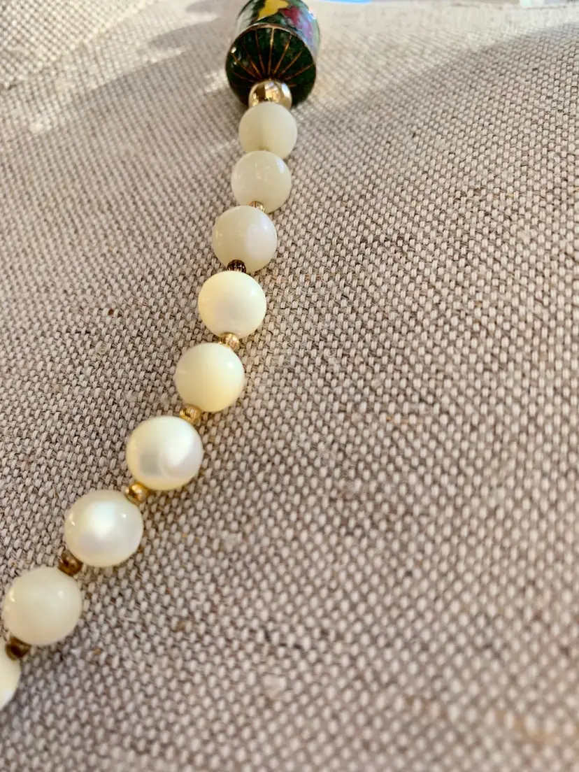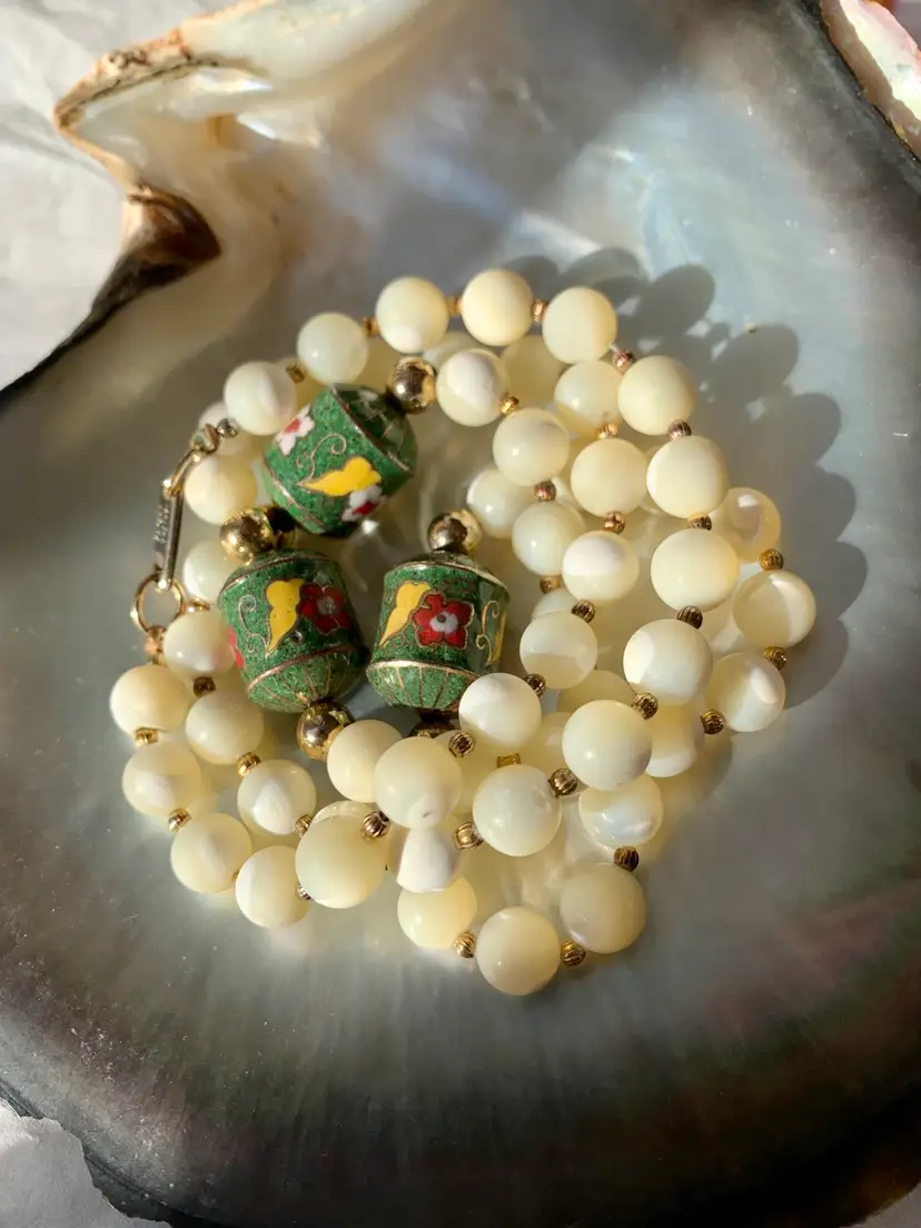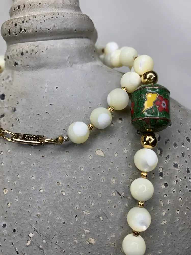 Lovely 24” Hobe necklace. The mother of pearl beads have great luminosity and the 3 green cloisonné beads are in great condition. The innovative, patented clasp makes it easy to put on and take off this piece.