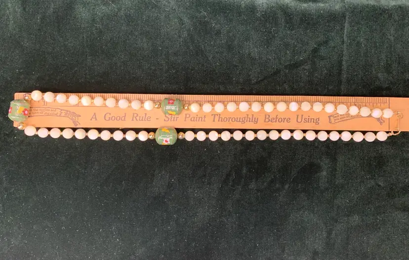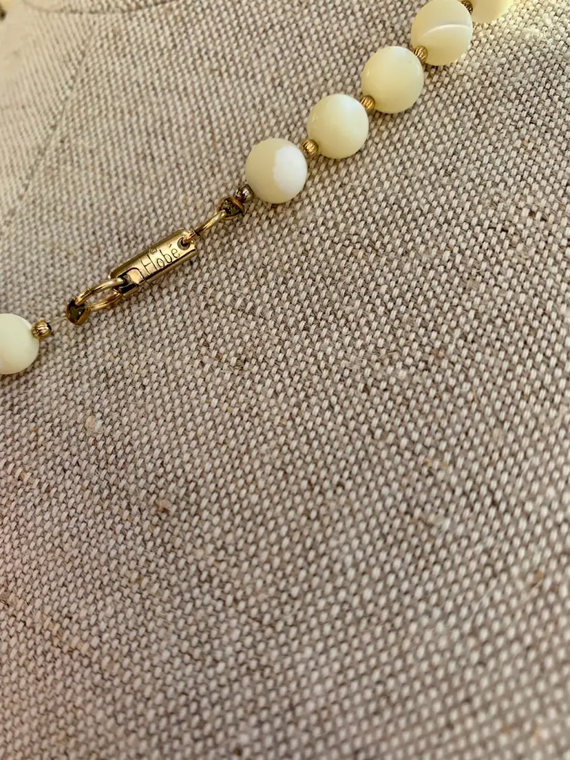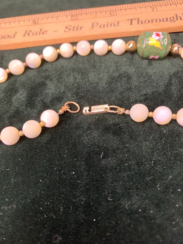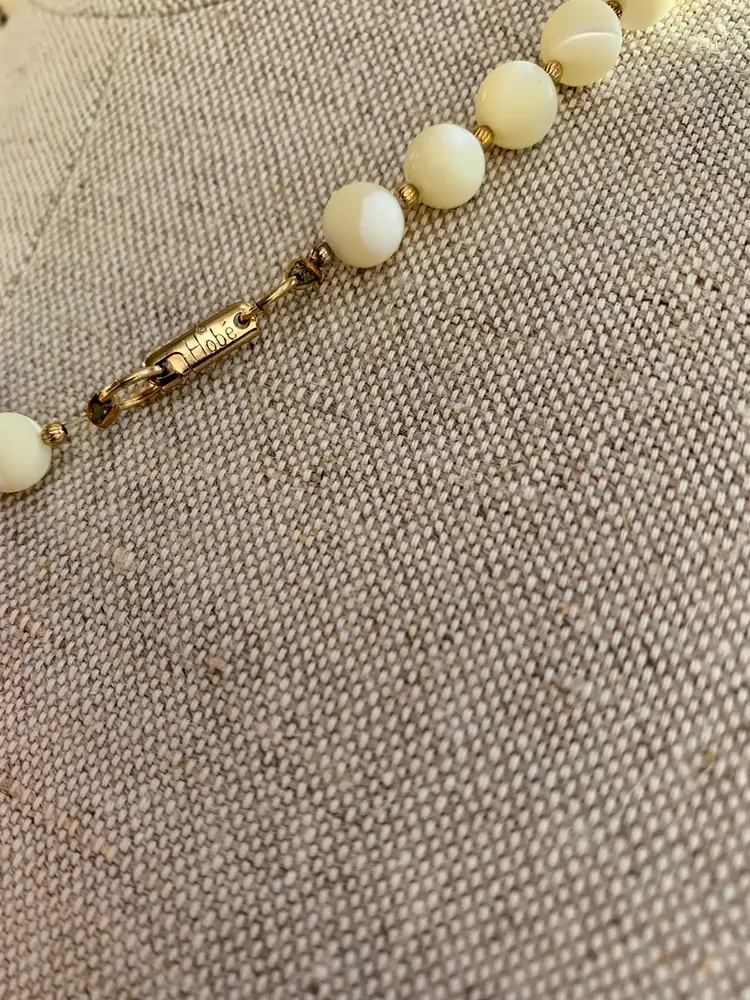 Lovely 24” Hobe necklace. The mother of pearl beads have great luminosity and the 3 green cloisonné beads are in great condition. The innovative, patented clasp makes it easy to put on and take off this piece.