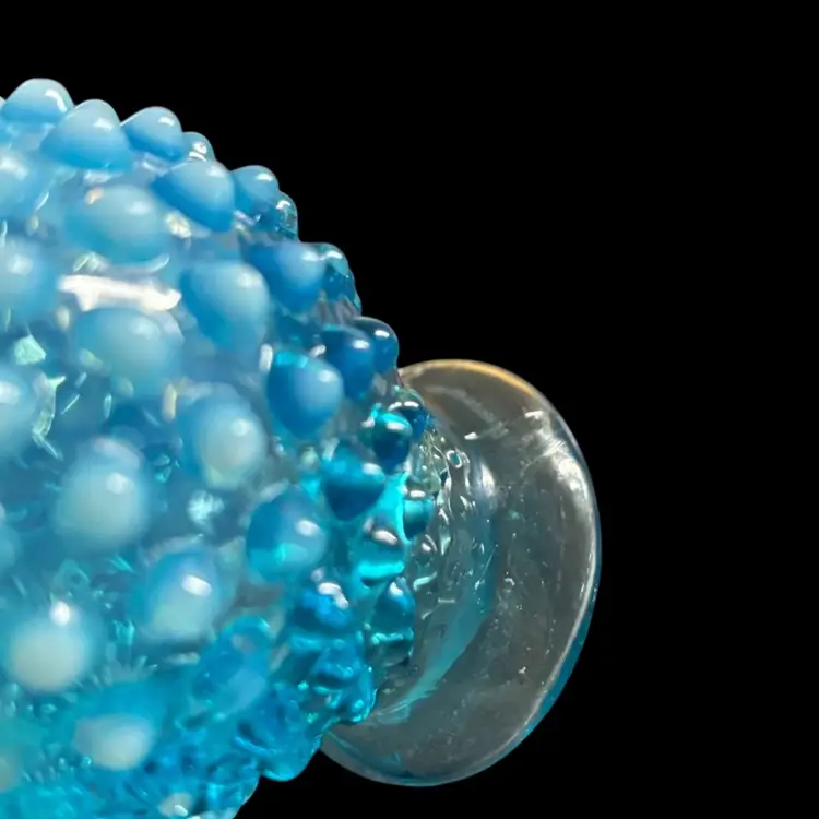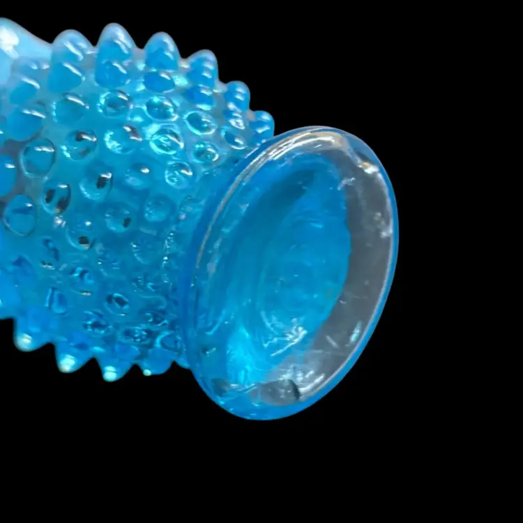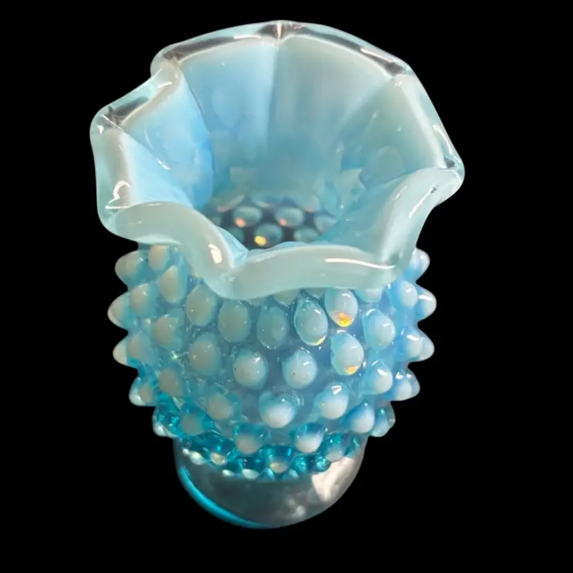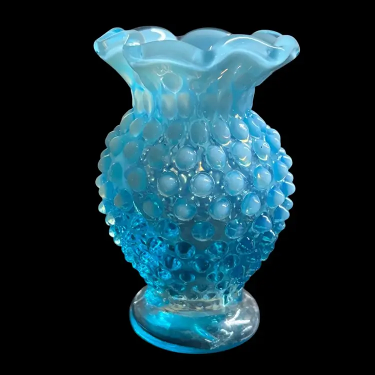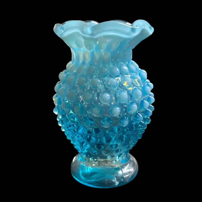 Pretty blue opalescent hobnail vase. No chips or cracks, manufacturing imperfections noted to base. 2x3.5”