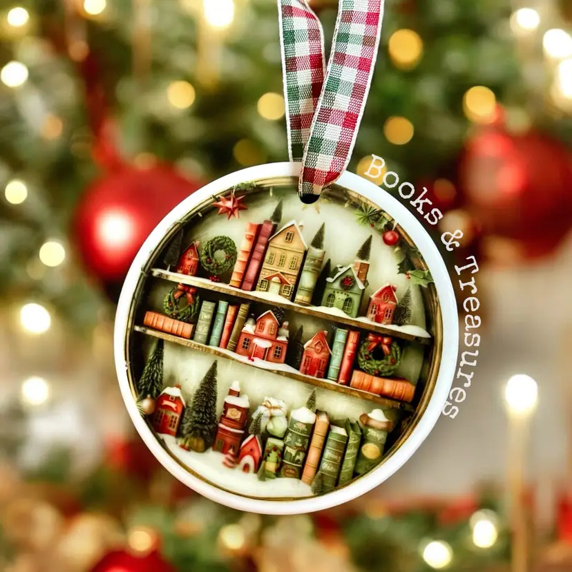 This ornament is ceramic with a lovely winter bookshelf image on both sides. Hang with the attached festive ribbon. Ribbon design may not be exactly the same as pictured.