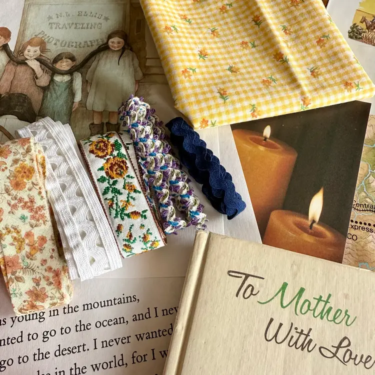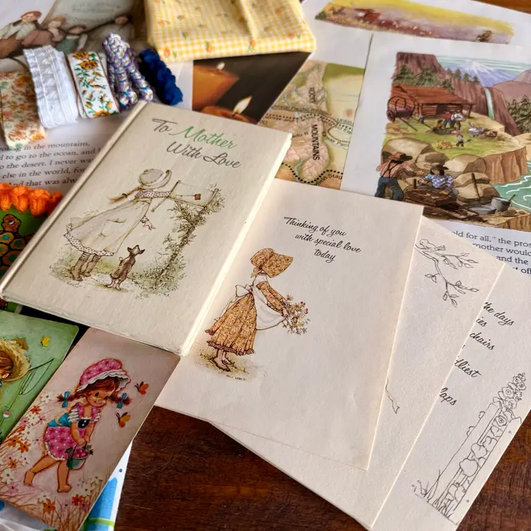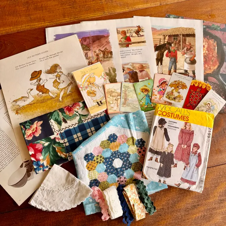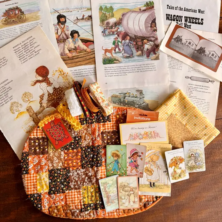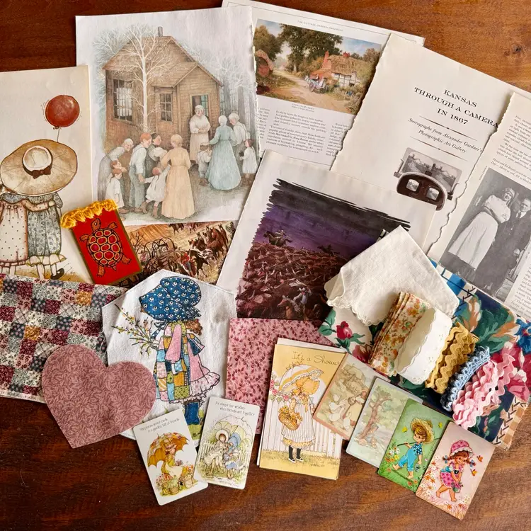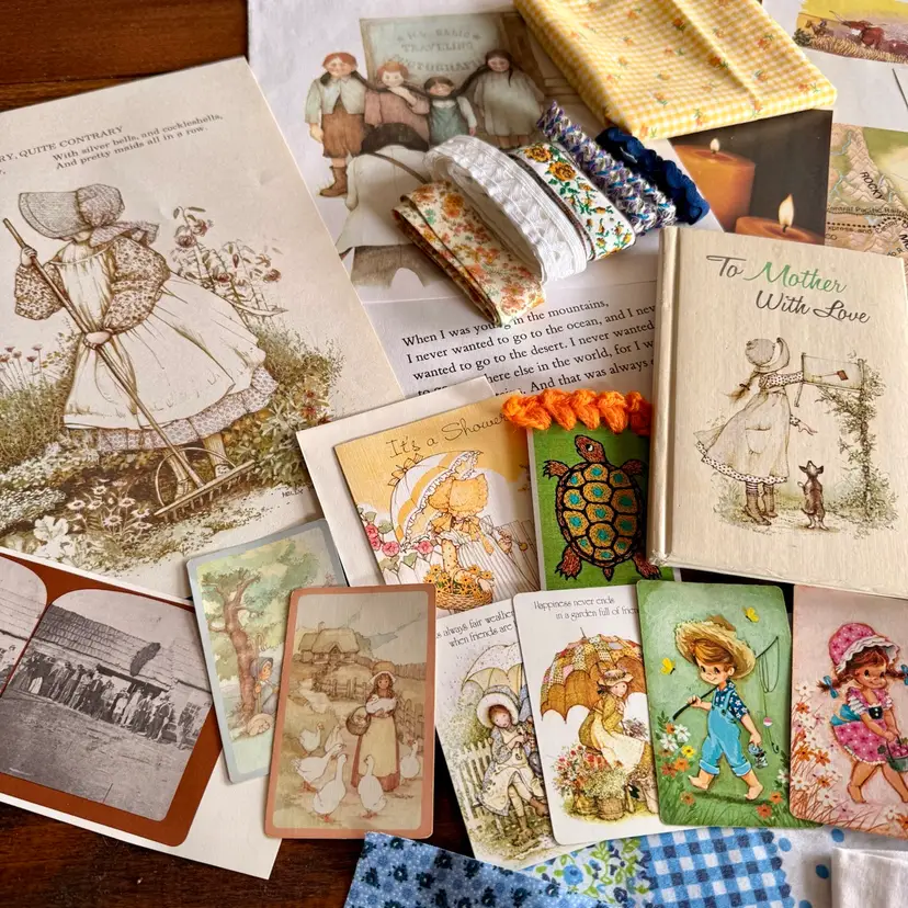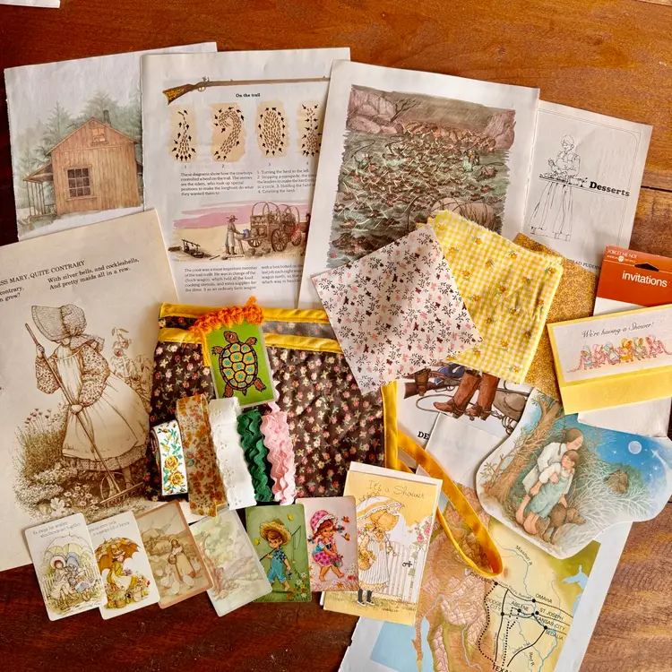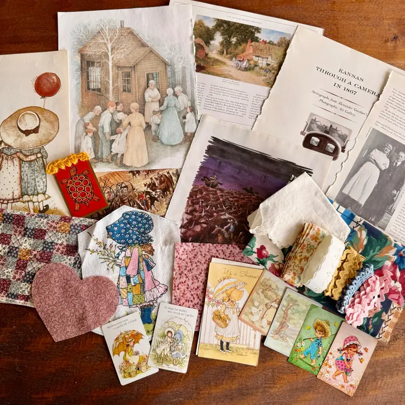 These bundles are loaded with Prairie goodness and each contains a touch of rare, Holly Hobbie, authentic ephemera plus 4 1/2 yards of vintage trims, playing cards, vintage invitation, book pages and a fat quarter and other coordinating remnants. Each kit is a bit different as you can see in the pictures. Please contact me in the chat here on Districts if you have any questions.