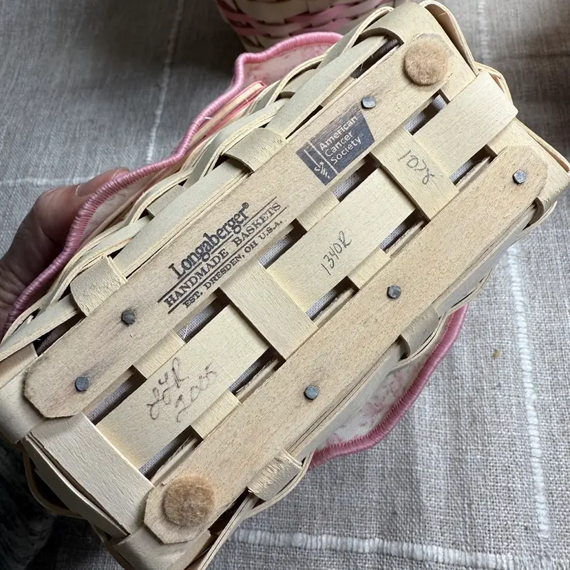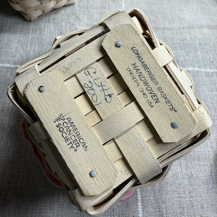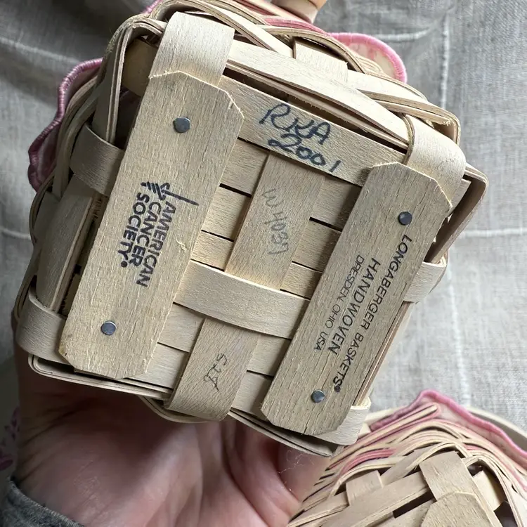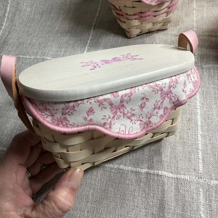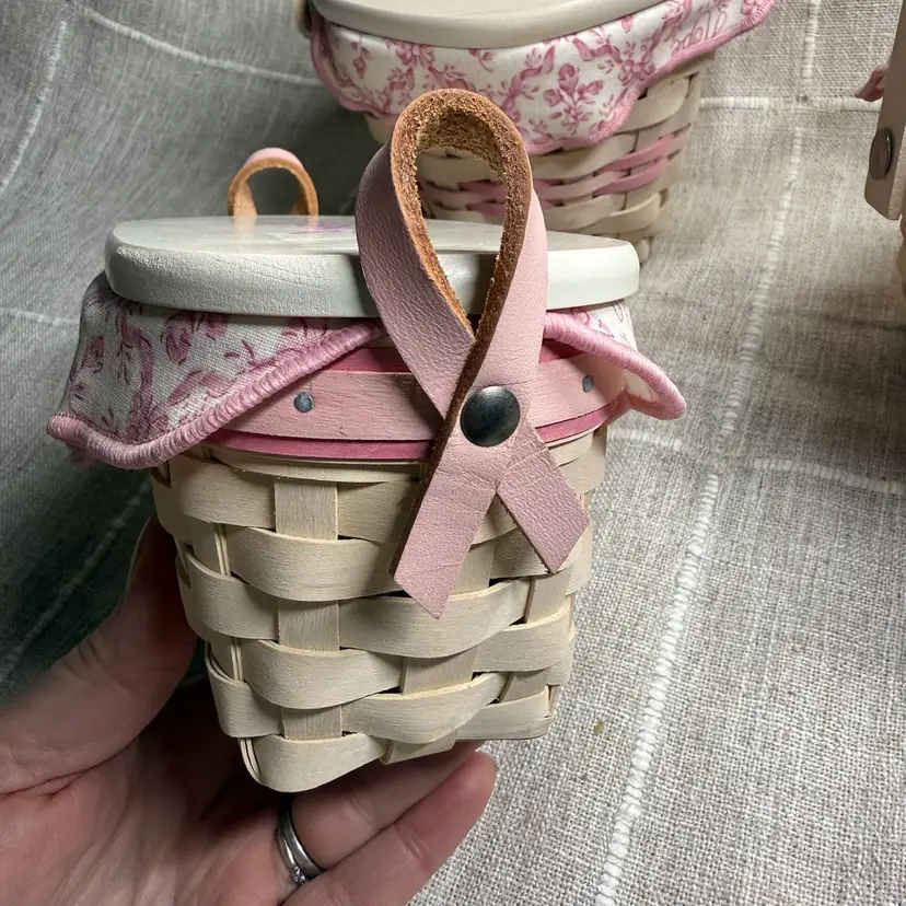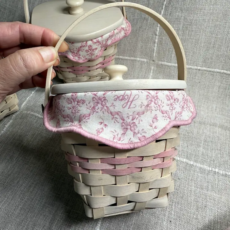 These beautiful, “like new” condition, handcrafted baskets are the perfect solution for keeping small crafting (or other) items stored close at hand in a lovely way. They all come with pink, floral, “Hope” fabric liners and hard plastic basket protectors as well. Woven wood construction with solid wood lids in a white washed finish. These were originally released between 2001-2005 to benefit the American Cancer Society and would make a lovely gift for a survivor in your life or in memory of a fighter! Hexagon lid baskets 6” wide, 5.5” tall at the top of the lid handle. Shortest oval basket lid is approximately 4.5”x6” and 2.25”tall. Larger oval with bow and roses detail has pink leather “ribbon” handles and the lid measures approximately 6.75”x 3.75” and is 3.5” tall.