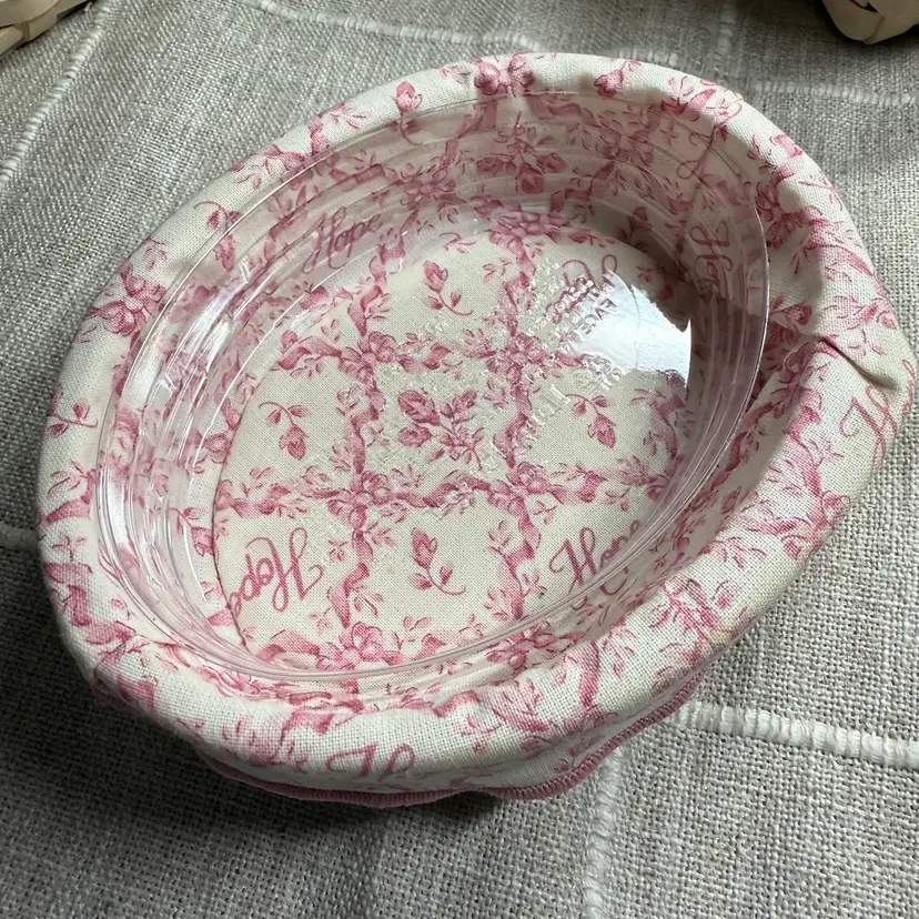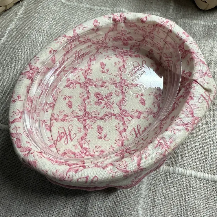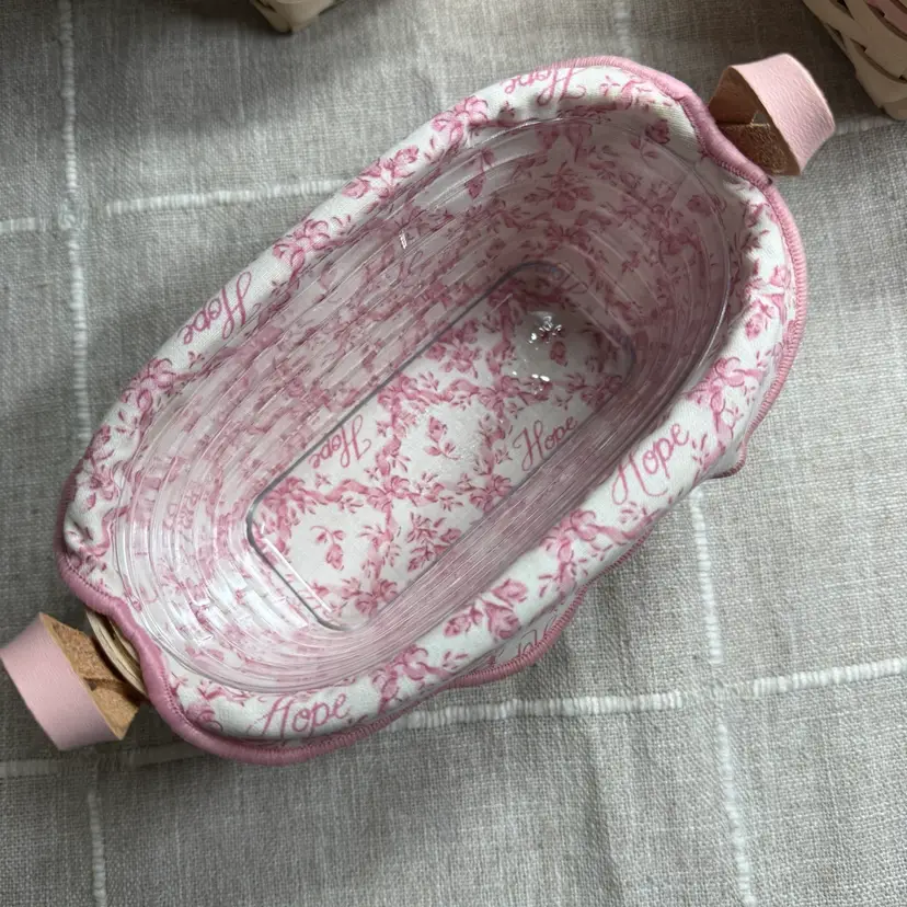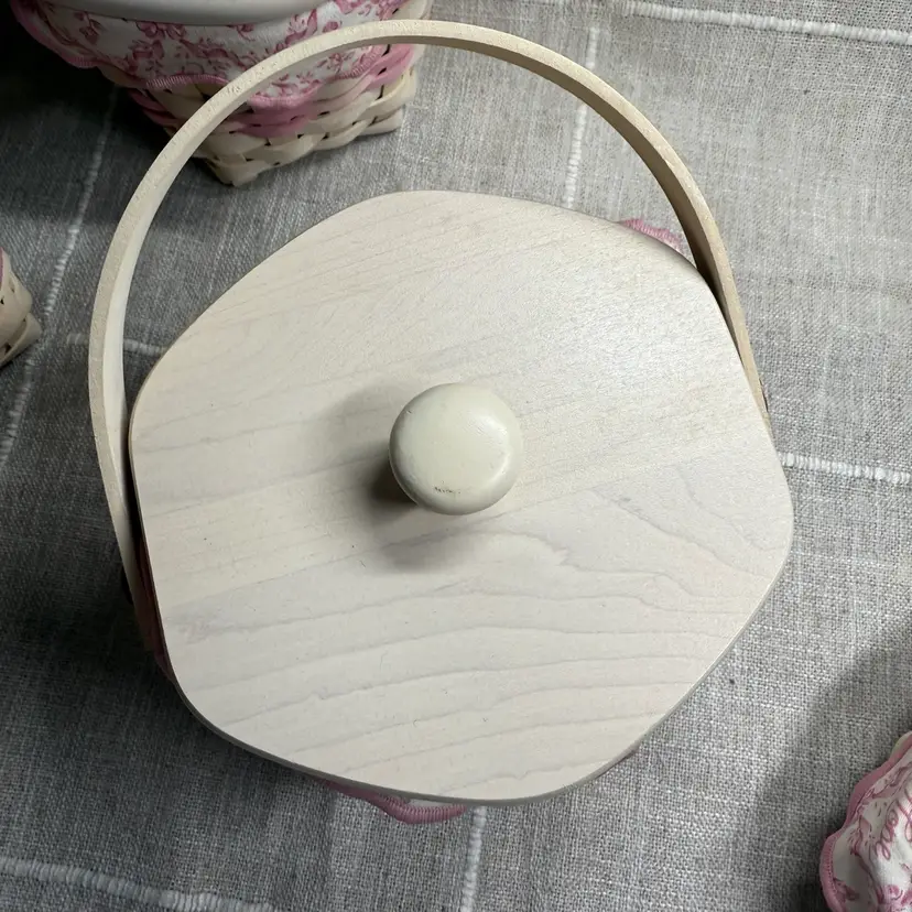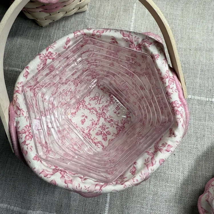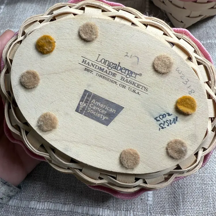 These beautiful, “like new” condition, handcrafted baskets are the perfect solution for keeping small crafting (or other) items stored close at hand in a lovely way. They all come with pink, floral, “Hope” fabric liners and hard plastic basket protectors as well. Woven wood construction with solid wood lids in a white washed finish. These were originally released between 2001-2005 to benefit the American Cancer Society and would make a lovely gift for a survivor in your life or in memory of a fighter! Hexagon lid baskets 6” wide, 5.5” tall at the top of the lid handle. Shortest oval basket lid is approximately 4.5”x6” and 2.25”tall. Larger oval with bow and roses detail has pink leather “ribbon” handles and the lid measures approximately 6.75”x 3.75” and is 3.5” tall.