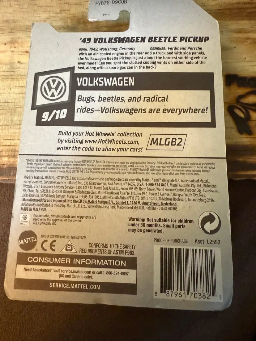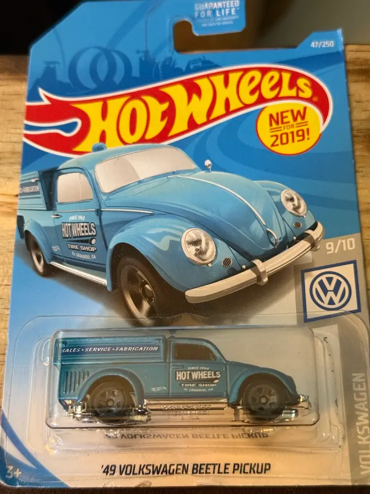 Model Details: This is the '49 Volkswagen Beetle Pickup, part of the 2019 Hot Wheels Volkswagen mainline series, identified as 47/250 in the main series and 9/10 in the Volkswagen series. Color: The model featured is metallic blue.