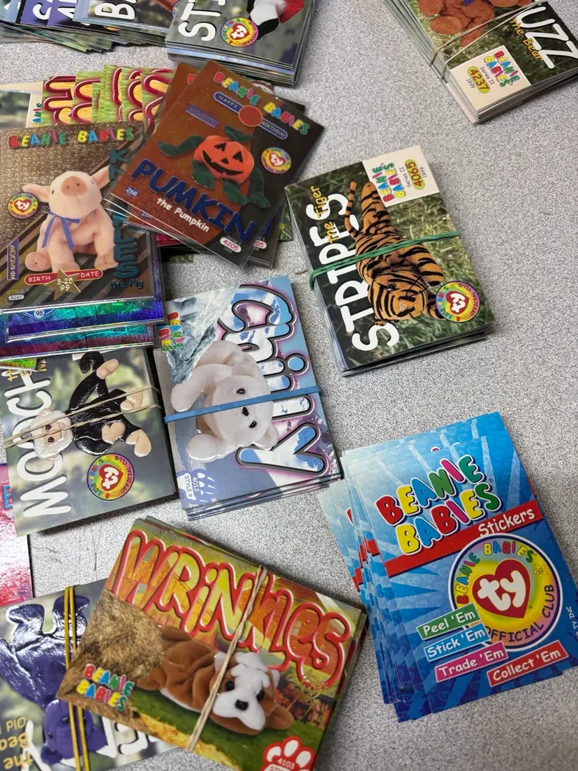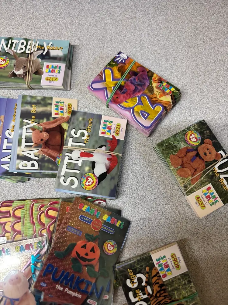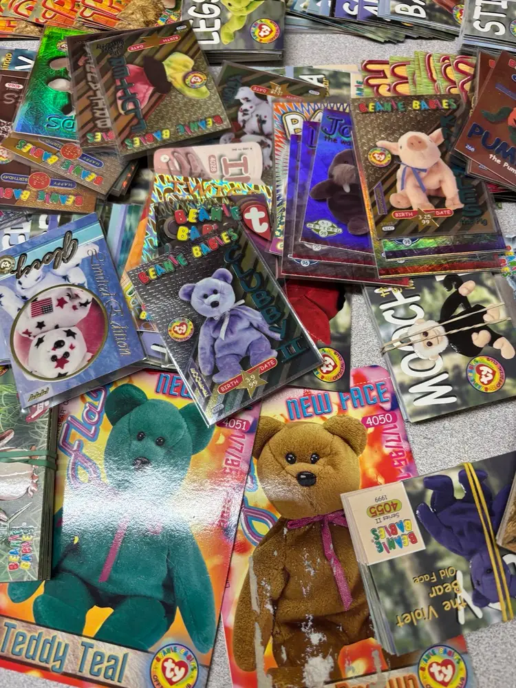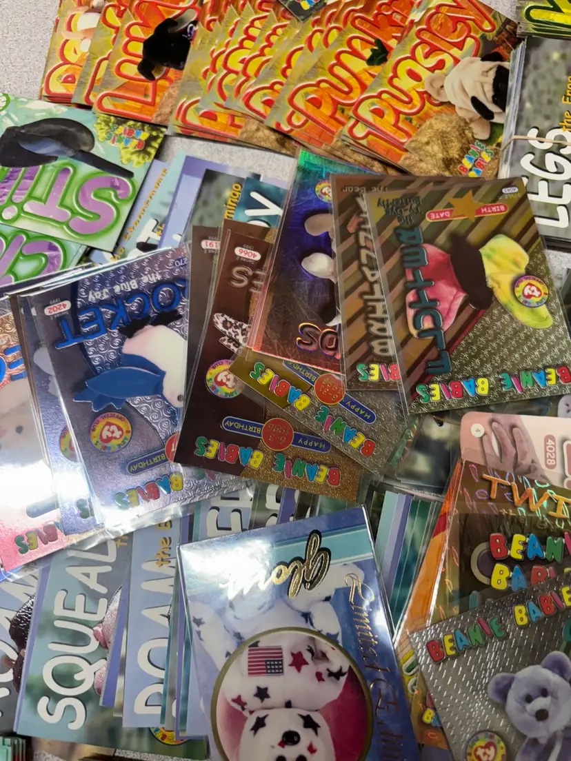 Massive lot of over 500 plus TY Beanie Babies collector cards from the 1990s. Includes Series I, II, and III with a wide mix of character cards, holograms, checklists, limited editions, and special inserts. Cards feature popular Beanies like Legs, Squealer, Wrinkles, Clubby, Peace Bear, and more. Most cards are in excellent condition, many still banded or stacked by set. Great bulk deal for collectors, resellers, or anyone nostalgic for the Beanie craze. Cards are ungraded and sold as-is.