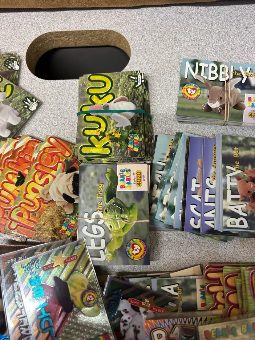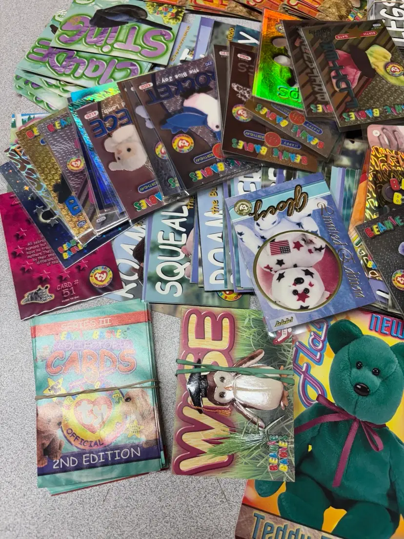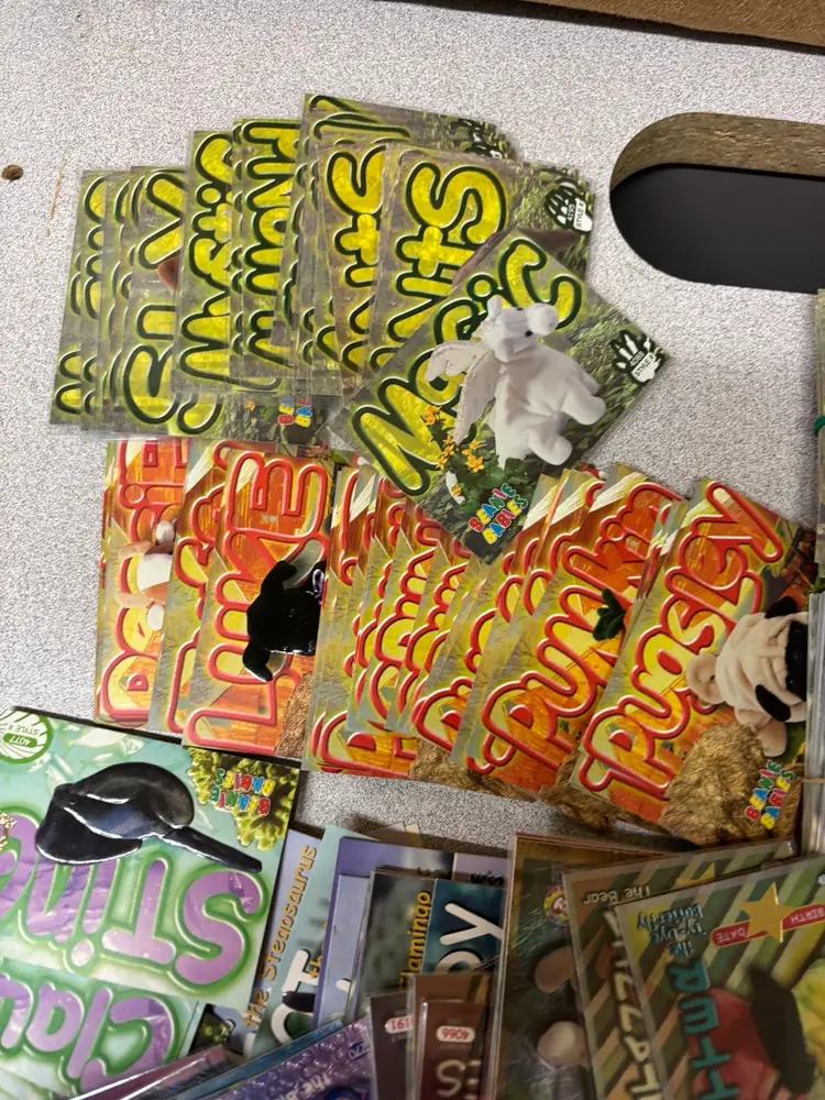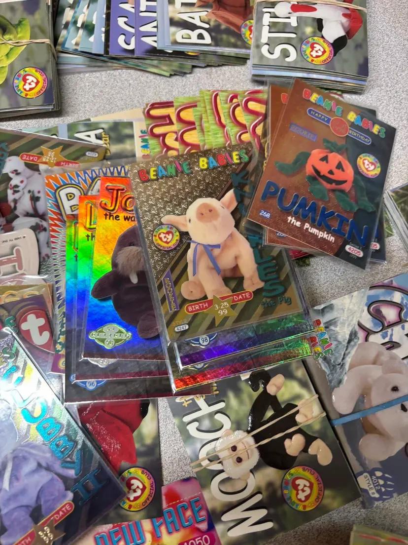 Massive lot of over 500 plus TY Beanie Babies collector cards from the 1990s. Includes Series I, II, and III with a wide mix of character cards, holograms, checklists, limited editions, and special inserts. Cards feature popular Beanies like Legs, Squealer, Wrinkles, Clubby, Peace Bear, and more. Most cards are in excellent condition, many still banded or stacked by set. Great bulk deal for collectors, resellers, or anyone nostalgic for the Beanie craze. Cards are ungraded and sold as-is.