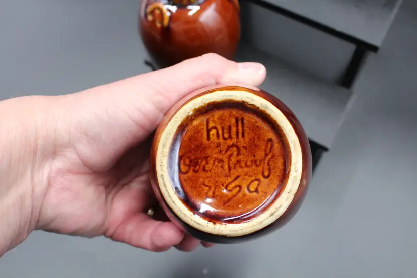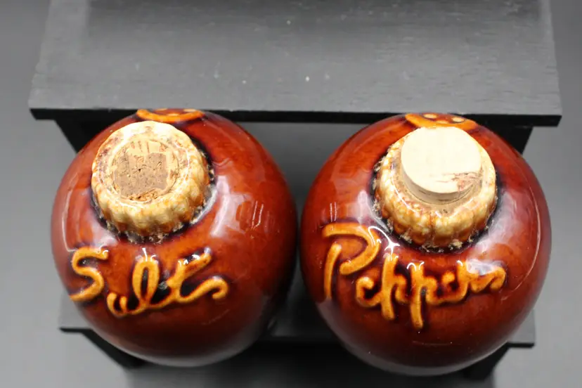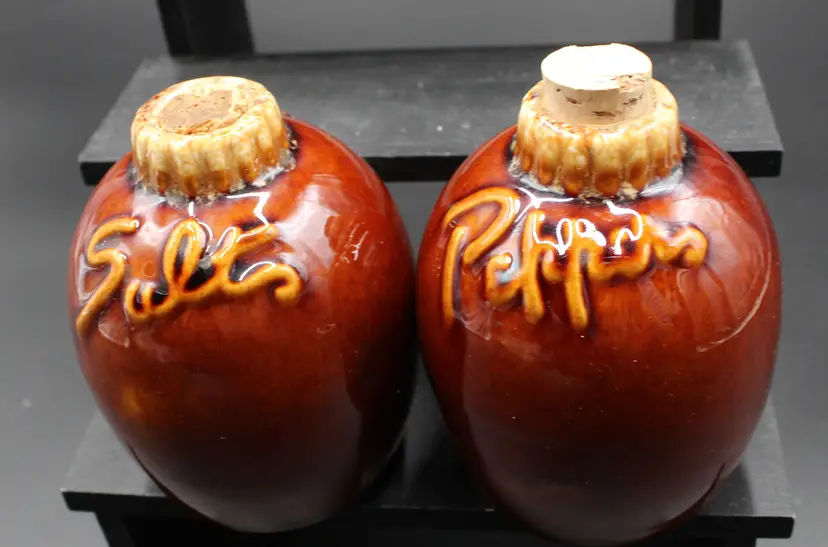 Note: Salt cork is original and at level of jug. Pepper cork is a replacement piece. No chips or cracks