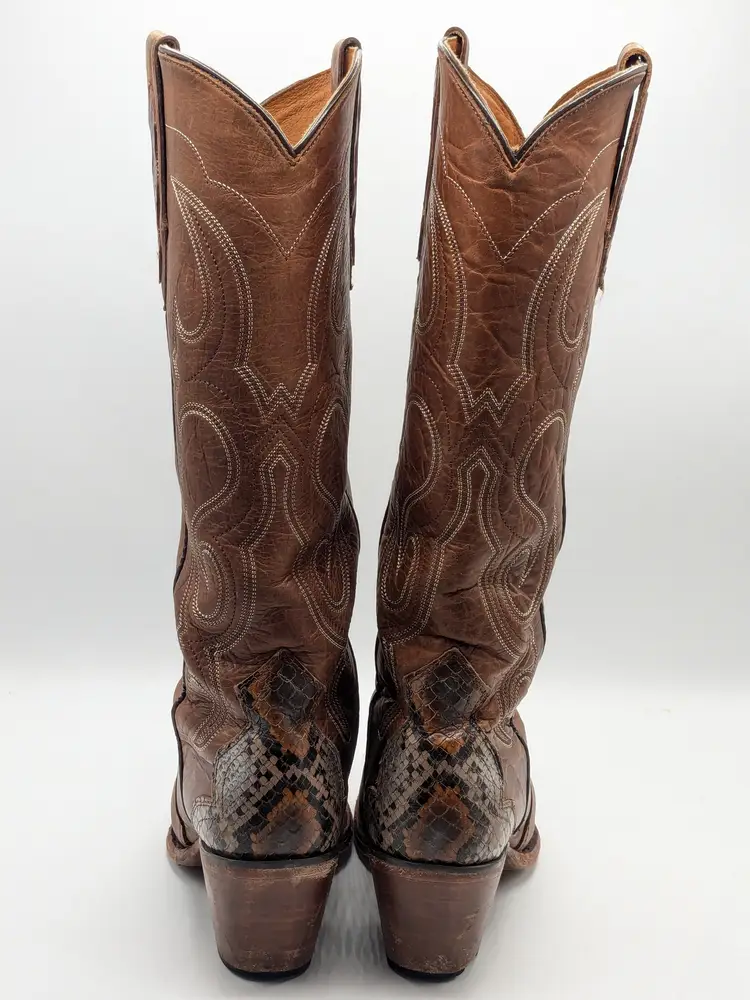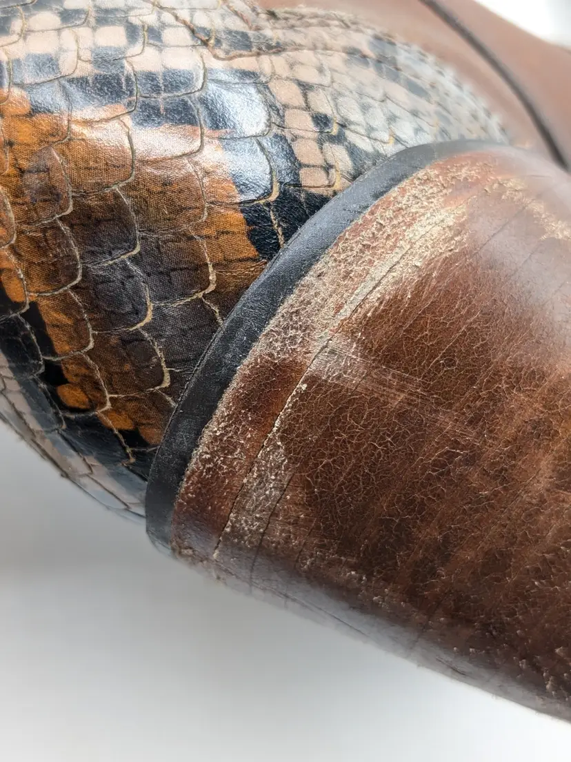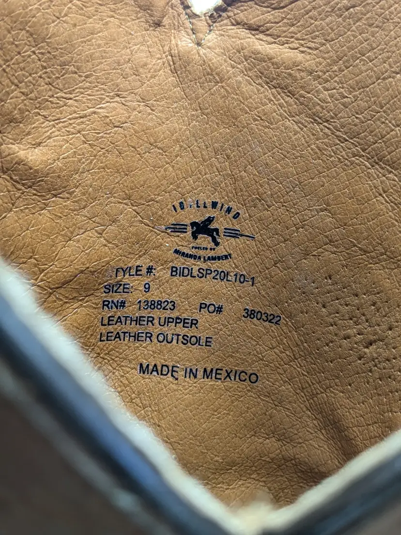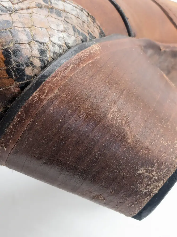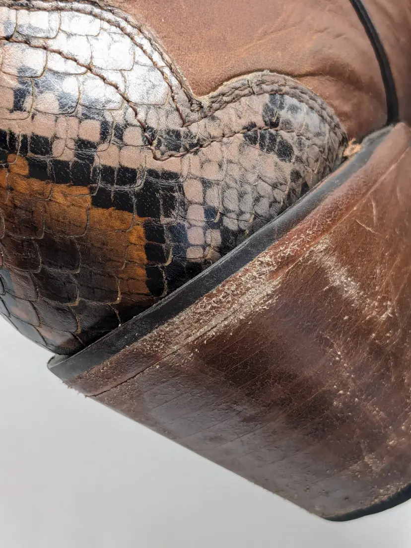 READ: Boots have been worn and have scuffs on the heels, toe and bottoms. Zoom in on photos. Features faux snakeskin print detail. Style # BIDLSP20L 10-!. Leather upper and leather outsole. Size 9. Made in Mexico. No box. Idyllwind by Miranda Lambert Boots. (ENC)