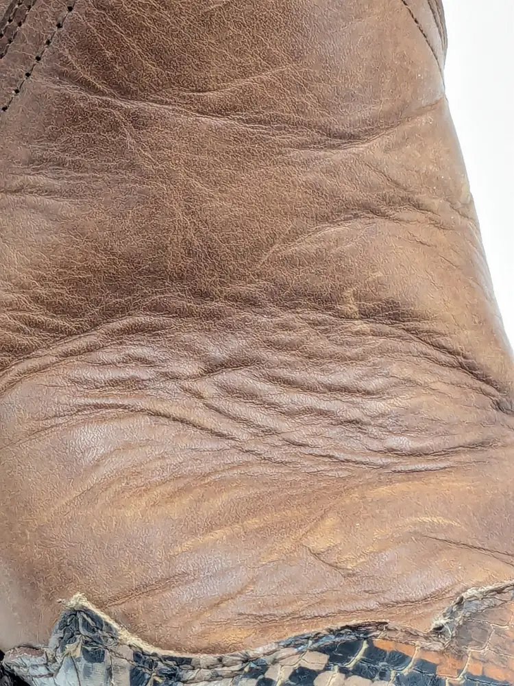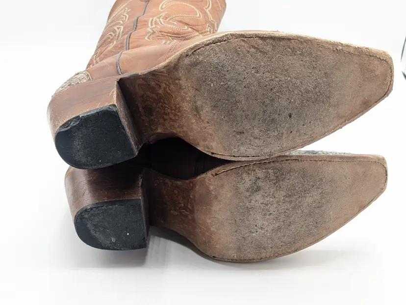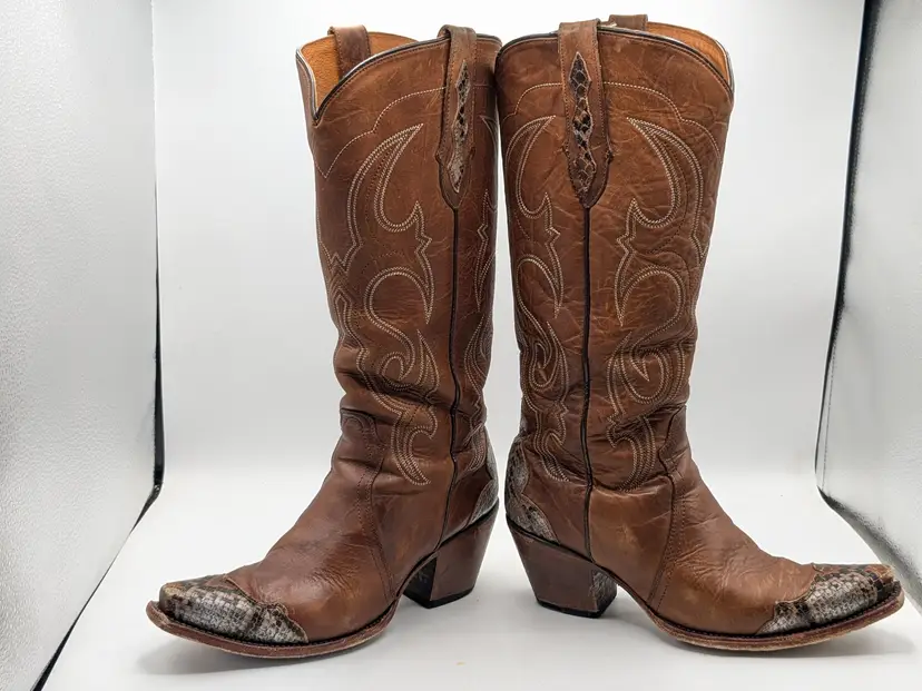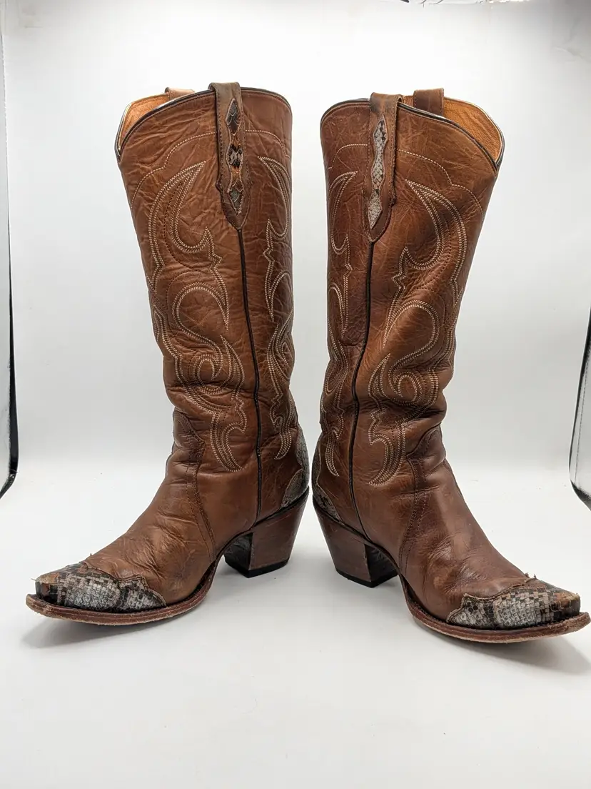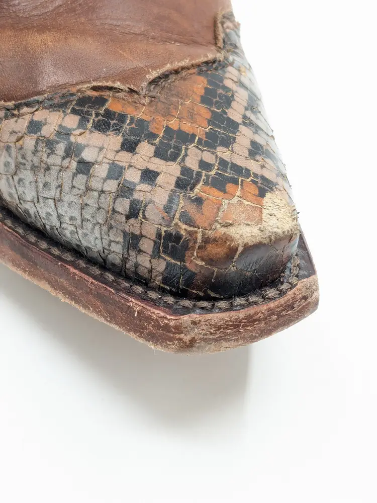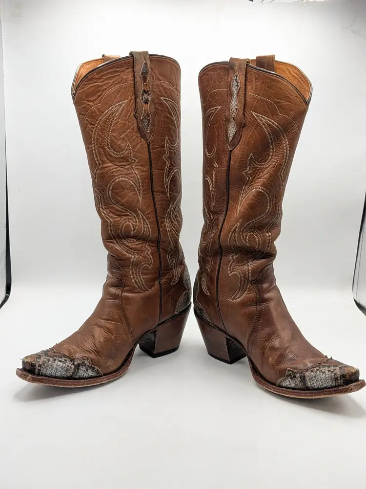 READ: Boots have been worn and have scuffs on the heels, toe and bottoms. Zoom in on photos. Features faux snakeskin print detail. Style # BIDLSP20L 10-!. Leather upper and leather outsole. Size 9. Made in Mexico. No box. Idyllwind by Miranda Lambert Boots. (ENC)