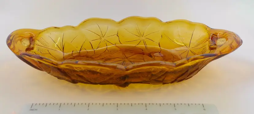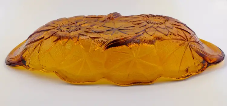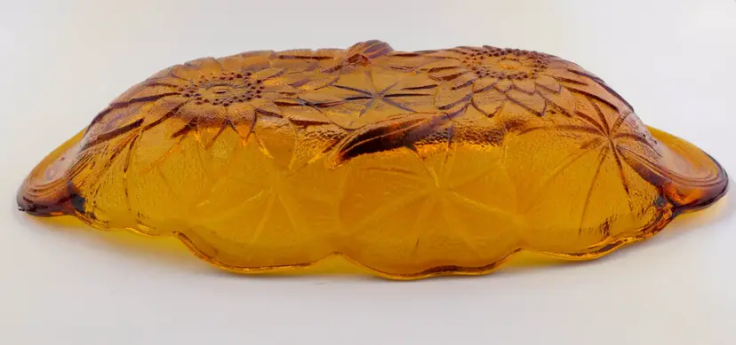 An oblong, amber-colored pressed glass dish. The pattern features a detailed sunflower motif. The top surface of the dish is smooth, and the bottom is textured. The dish has a scalloped, wavy edge and is in excellent condition. Approx. size: 9.5" long x 5" wide.