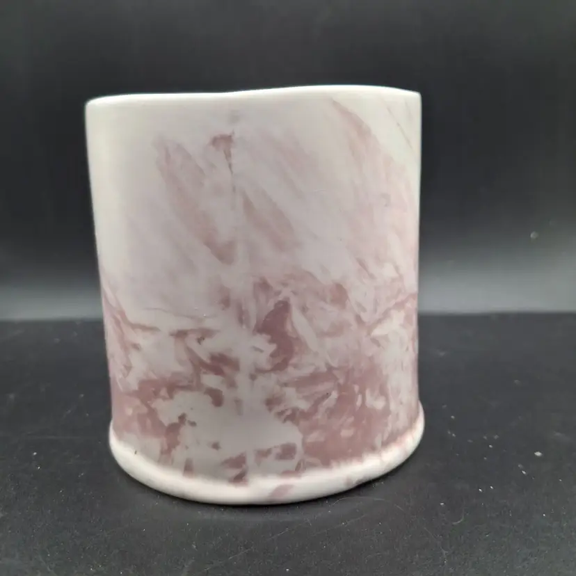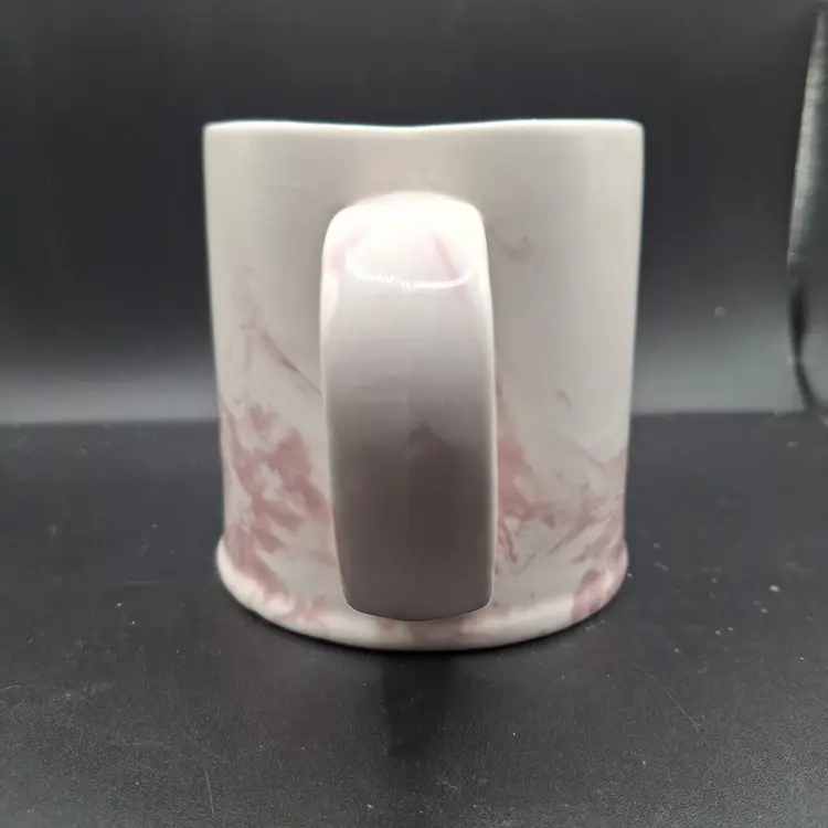 A sophisticated ceramic mug featuring a soft marble-like pink and white glaze, elegantly designed with a prominent letter "L" and crafted by Anthropologie. Perfect for professionals seeking a stylish desk accessory.
