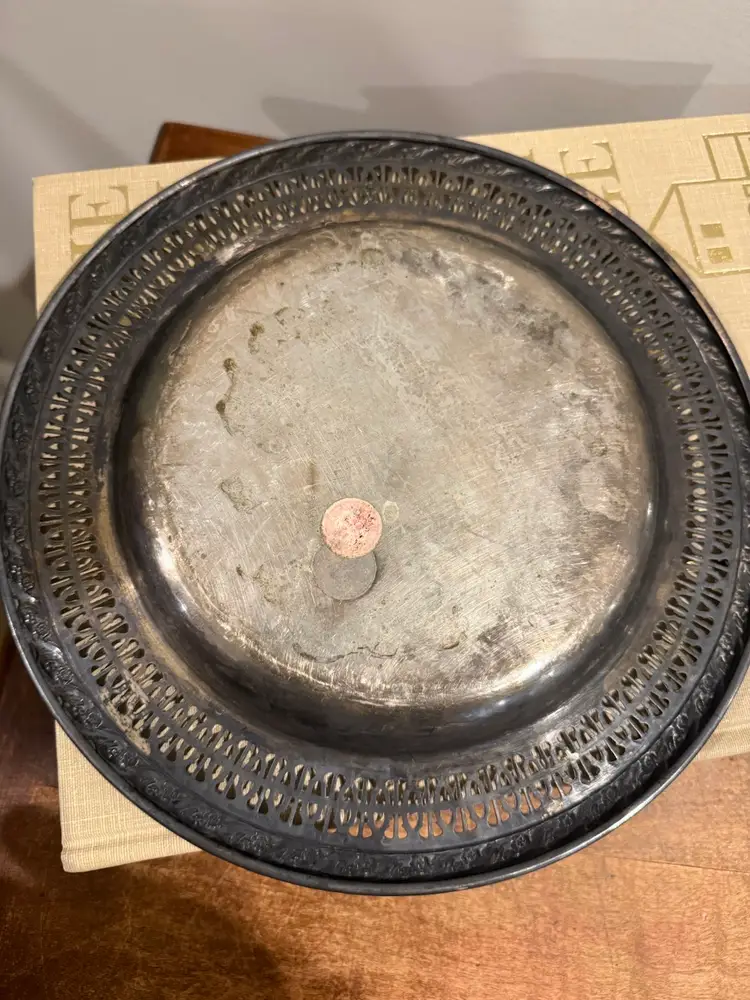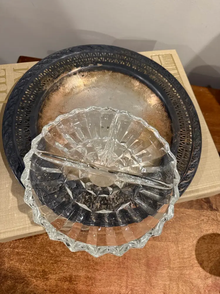 Vintage International Silver Company plated serving tray, complete with a coordinating glass insert. This elegant piece is ideal for entertaining, offering a sophisticated way to present appetizers, candies, or other small delicacies. The tray features intricate detailing along the rim, showcasing classic craftsmanship.