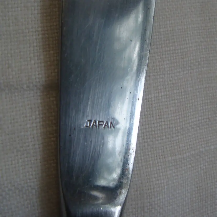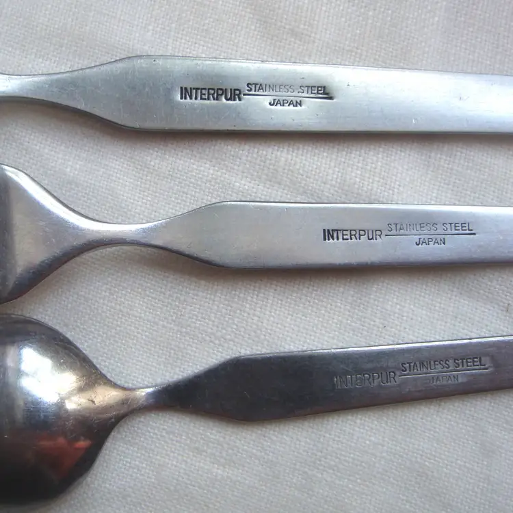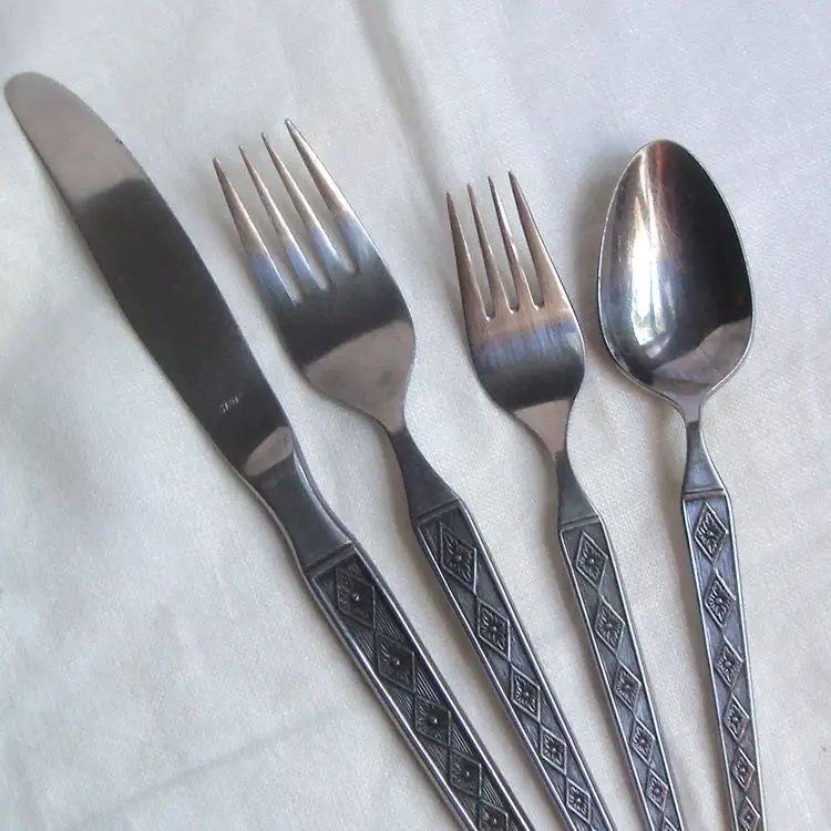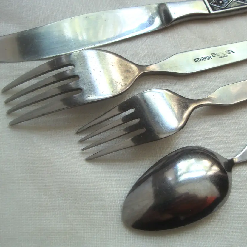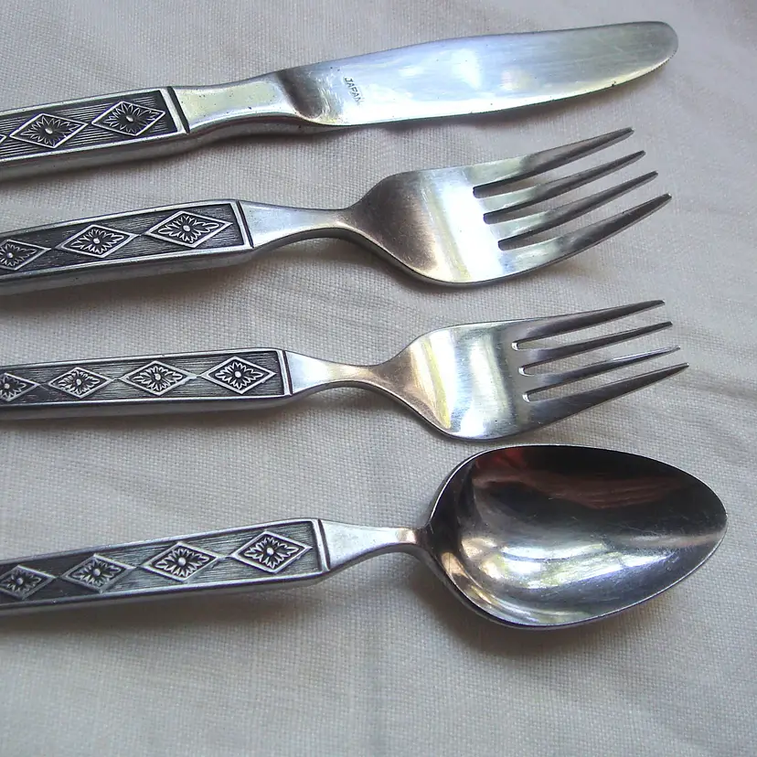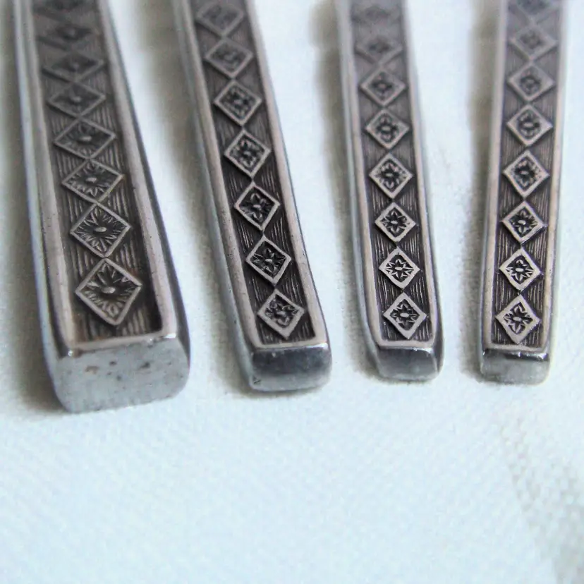 Set of 4 Vintage stainless steel flatware Dinner/Butter knife: 1 Dinner fork: 1 Dessert/Small fork: 1 Teaspoon: 1 Texture geometric diamond flower pattern Imperfections consistent with age and use, some uneven coloration. Has some weight Likely vintage, 60s/70s(?) Stamped, Japan. Rarer to find. mid-century dainty
