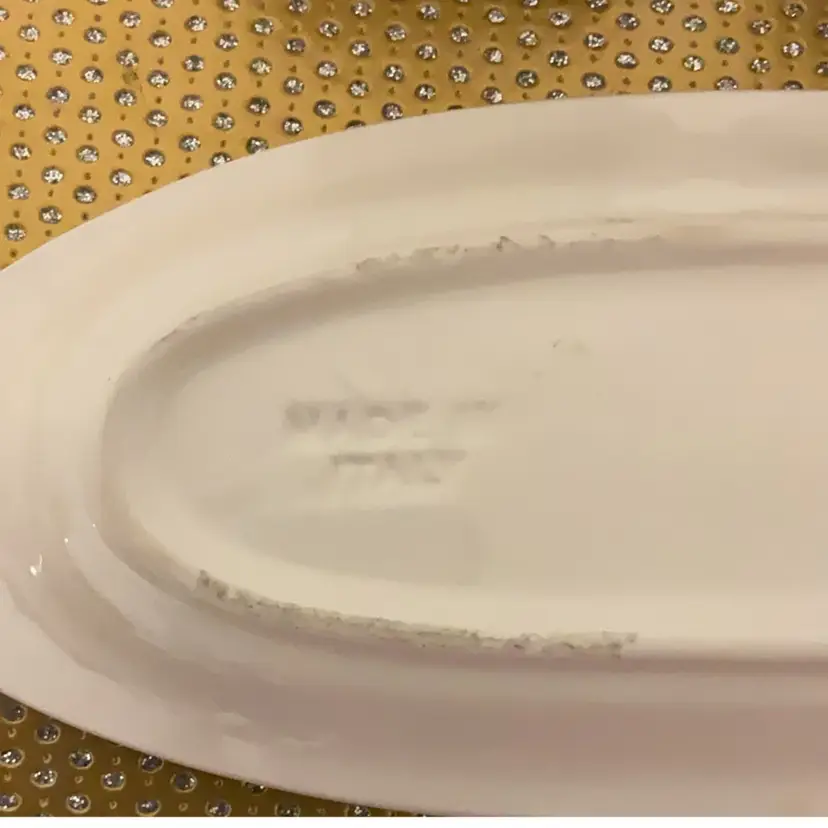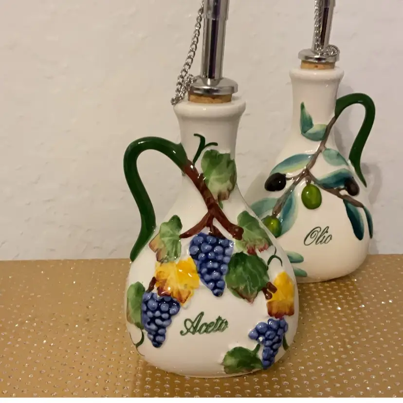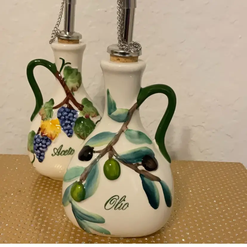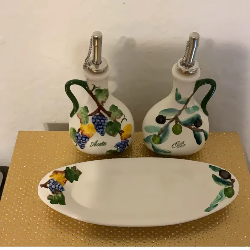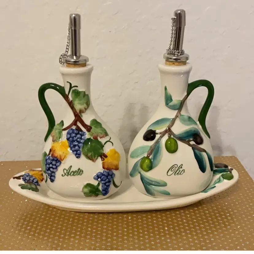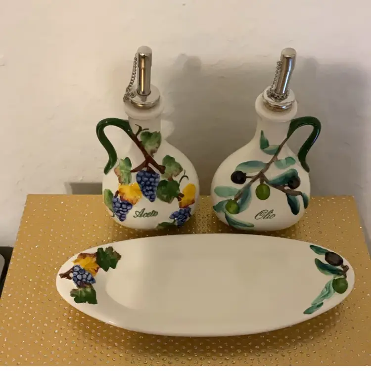 The bottles are hand painted with grape and olive design. Bottles are 6.5” x 4”. Tray is 9” x 1”. Made in Italy. Flea bite chip on one grape.