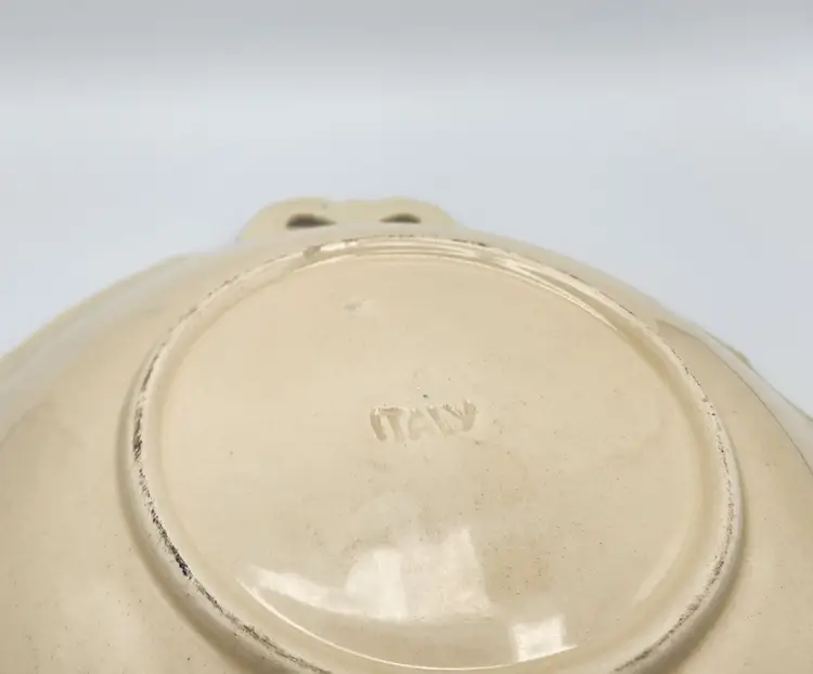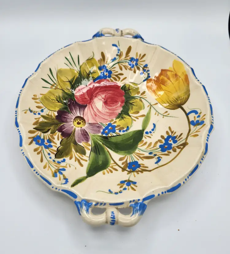 Italian Majolica Nove Rose Floral Handled Plate/Platter Hand-painted Flowers. Marked Italy. Minor glaze chips and wear. 10"wide, 1.5" deep