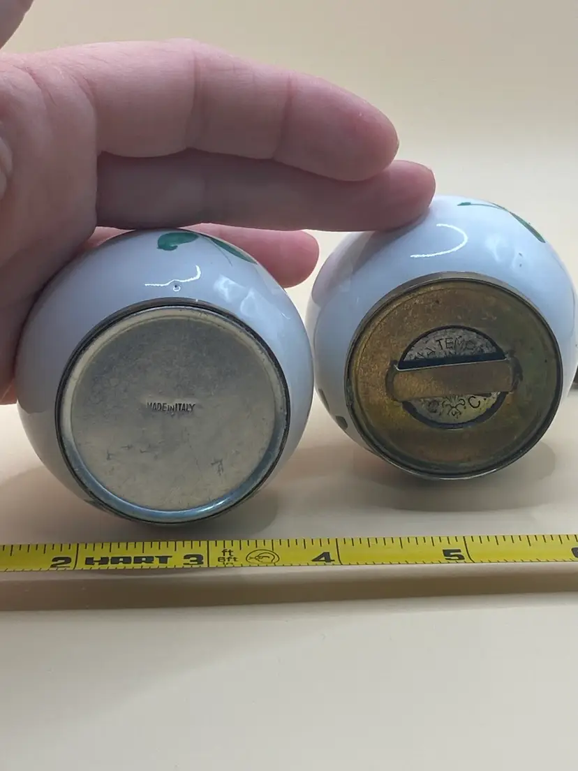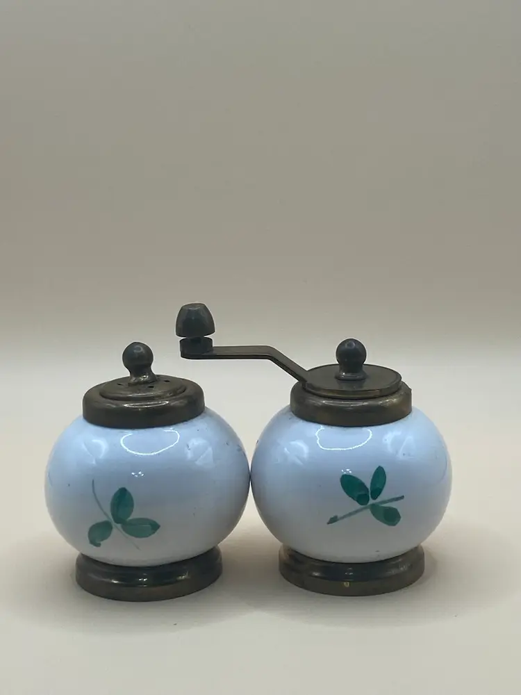 This nice little set is cute for a collector to have and display. The pepper grinder has moving parts that are vintage and may not be suitable for food use. There are no chips or cracks in the set. The metal tops could use a good cleaning, but it is a great set with no damage.