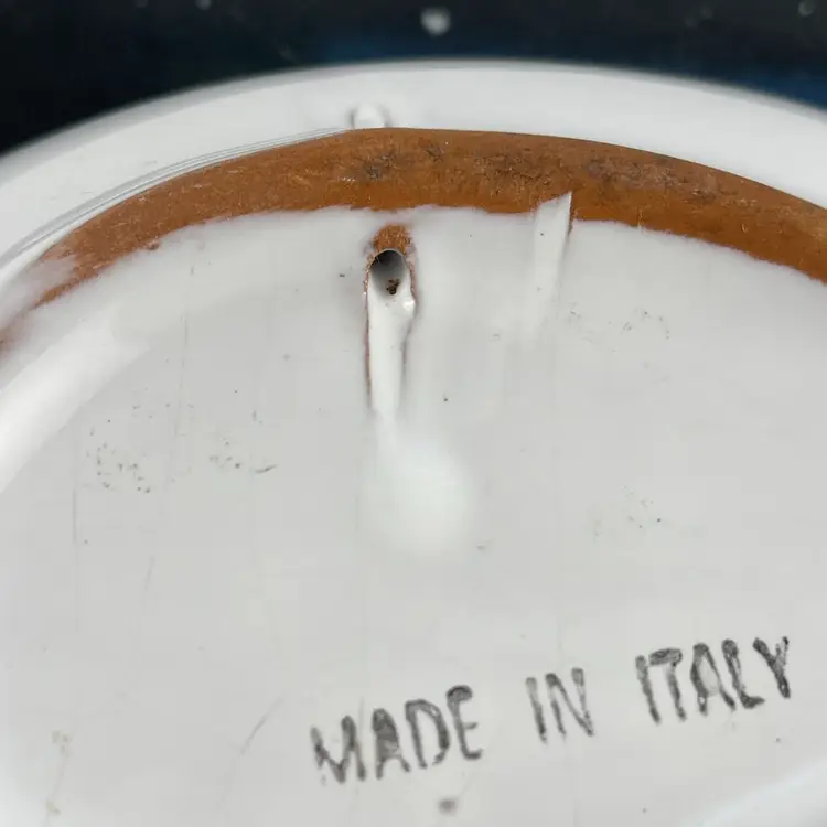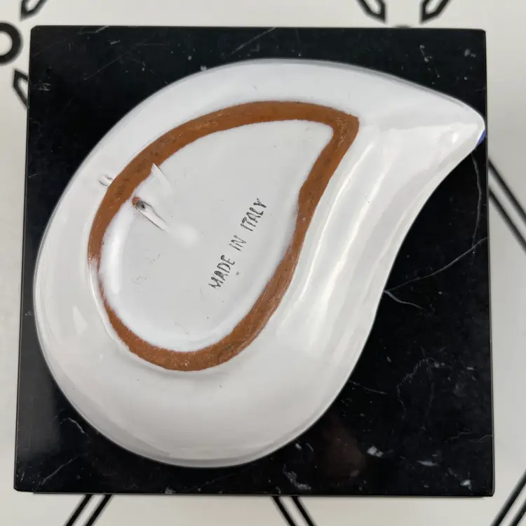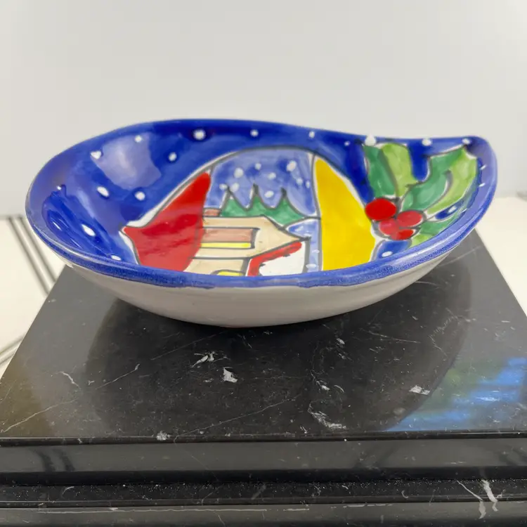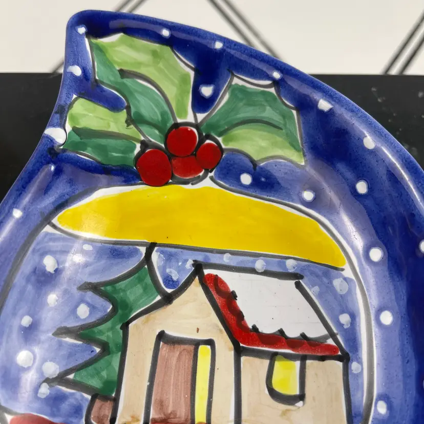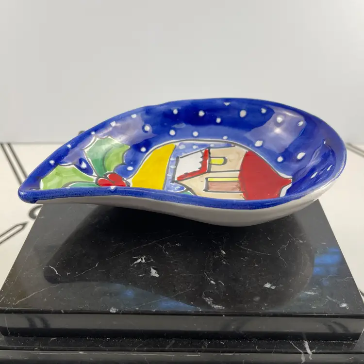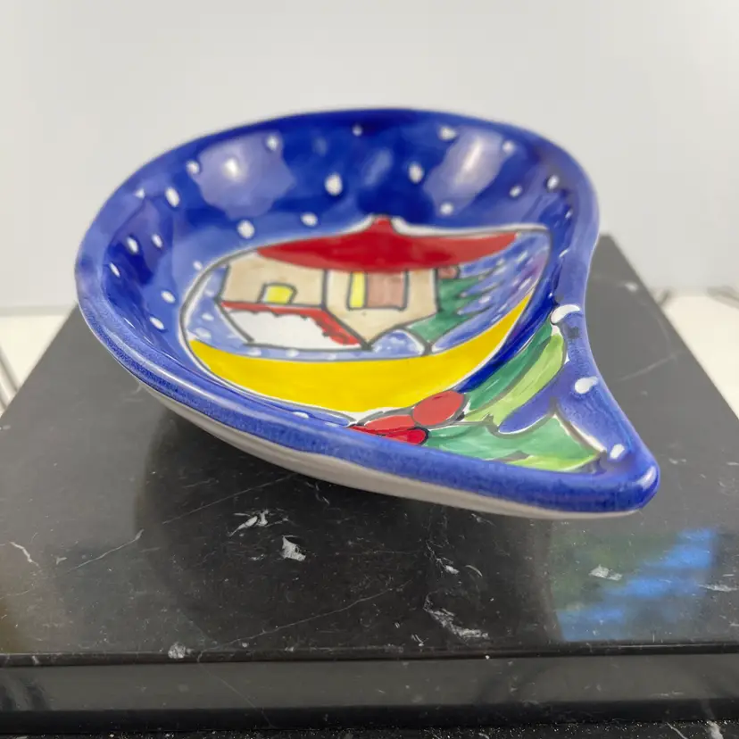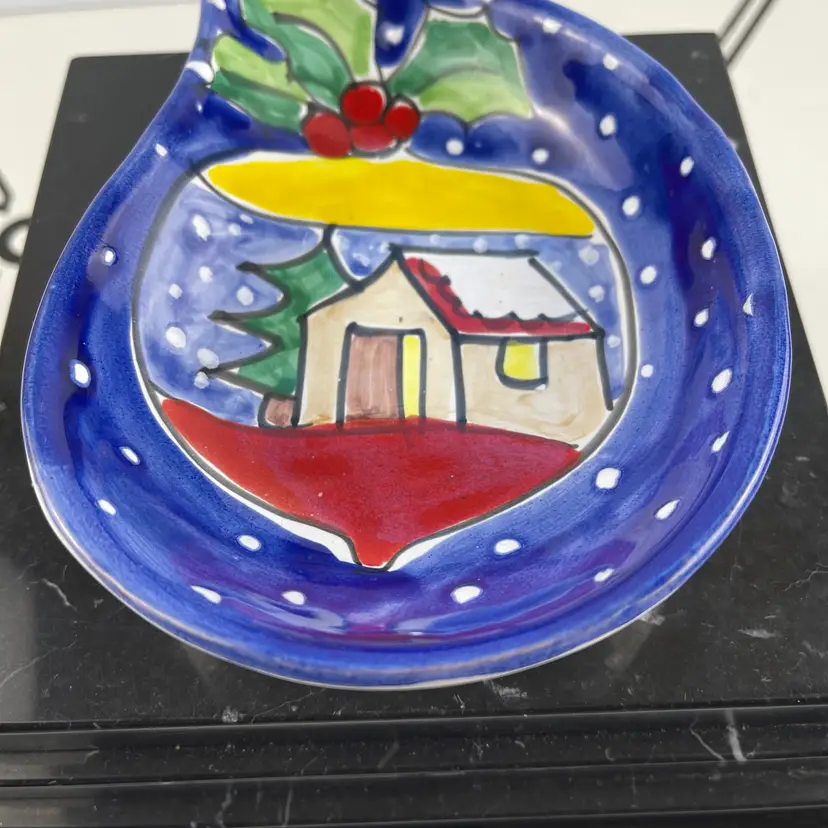 This Italian Pottery Winter Christmas Snow Globe Spoon Rest Trinket Dish is a beautifully handpainted piece with a tear drop shape, perfect for winter-themed occasions. Crafted from clay with a glossy finish, this Italian pottery spoon rest trinket dish features intricate Christmas tree patterns in vibrant colors. It has the ability to hang on the wall, making it a unique and festive addition to any home decor collection.