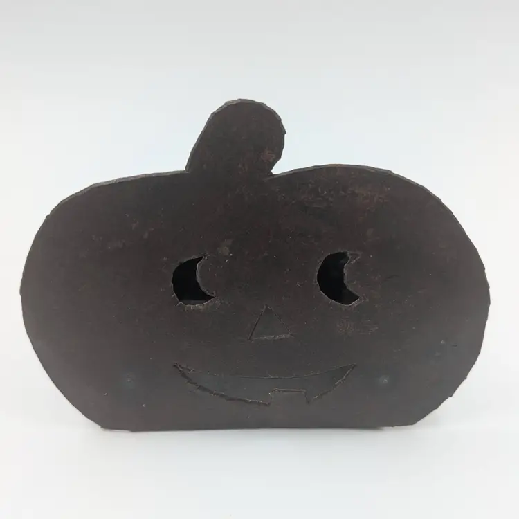 Cute metal votive holder with a jack-o'-lantern metal cutout on the front of a square metal candle holder. Has a couple small rusty spots but they blend in with the patina of the piece.