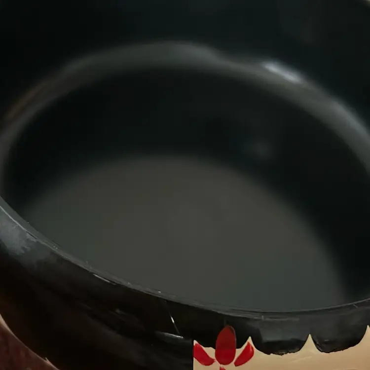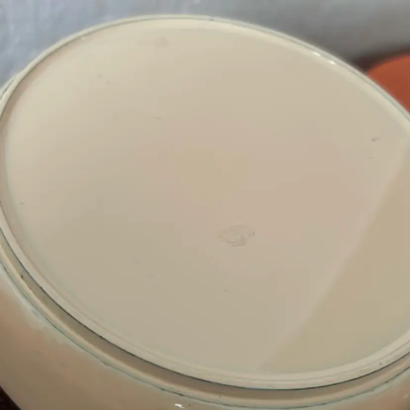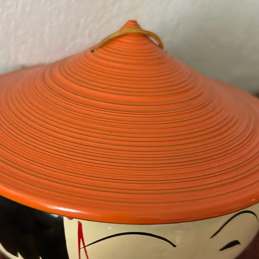 In great shape. Does have a few tiny paint losses on the bowl. Very adorable display piece. The plastic that it is made of reminds of the melamine dishes plastic. It measures: Across the lid: 6 inches. The bowl 5 inches across & 2 inches down. No makers mark.