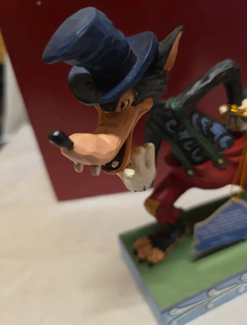 The product is a medium-sized figurine titled "Jim Shore Disney Traditions I'll Huff and I'll Puff 6005973 Big Bad Wolf" by artist Jim Shore. This traditional style figurine features a 3D effect, is a limited edition, retired piece, and comes boxed. The hand-painted resin figurine depicts the Big Bad Wolf character from the Disney collection, making it a charming addition to any room for all occasions. Measuring 6.25 inches in height and 5 inches in width, this multicolored figurine captures the essence of classic Disney storytelling in a beautifully crafted design.