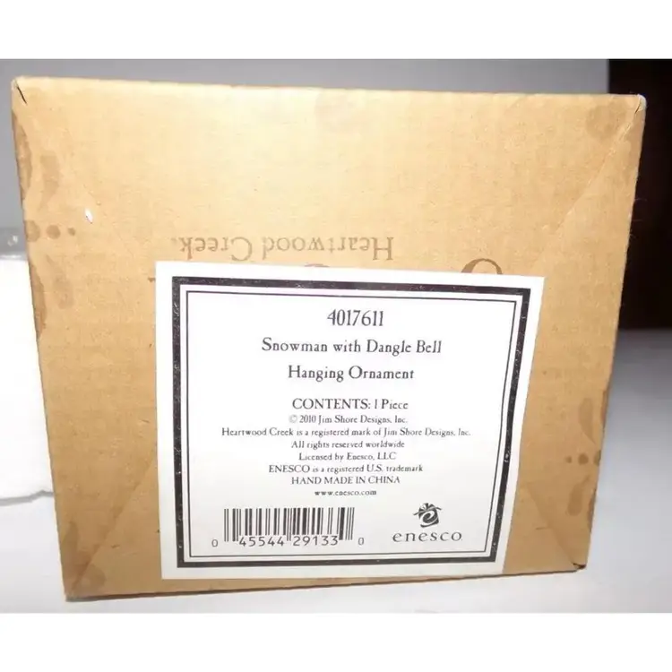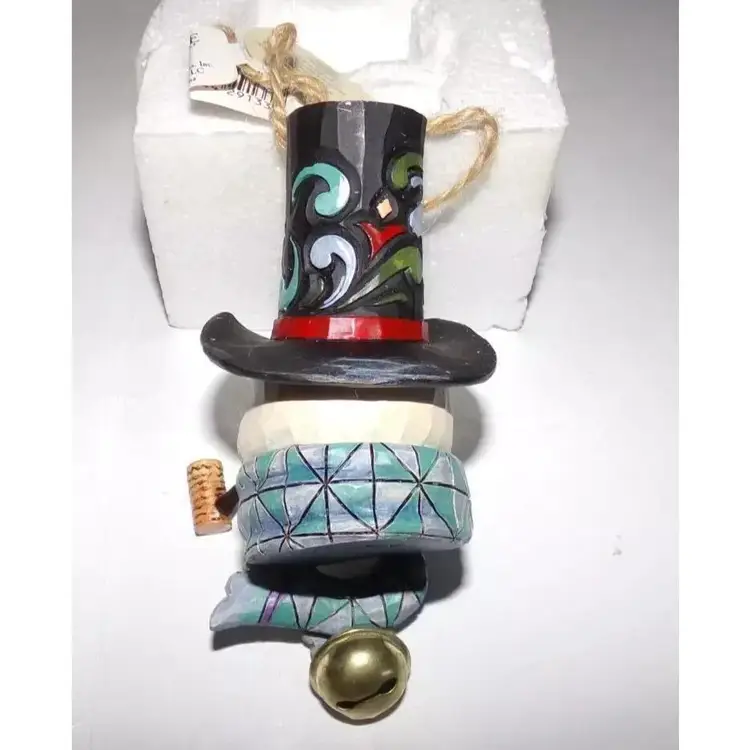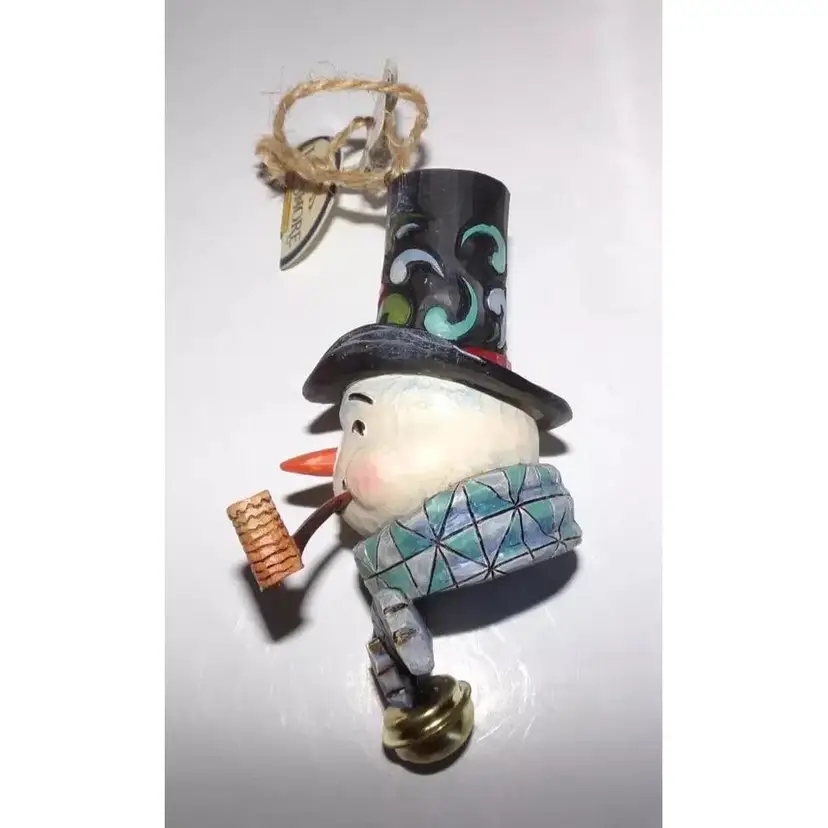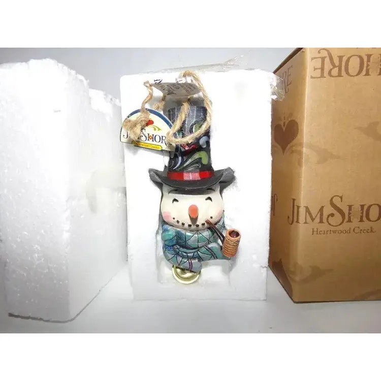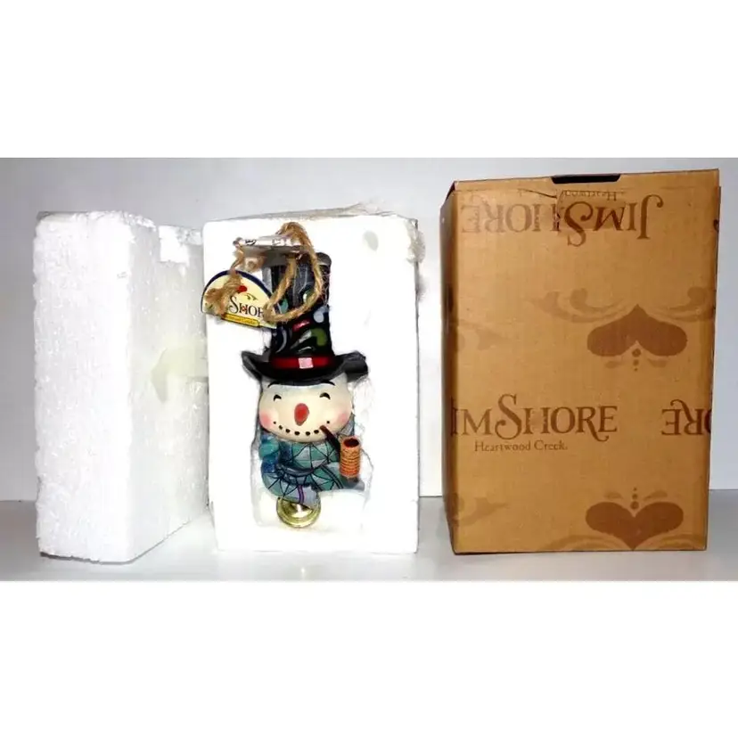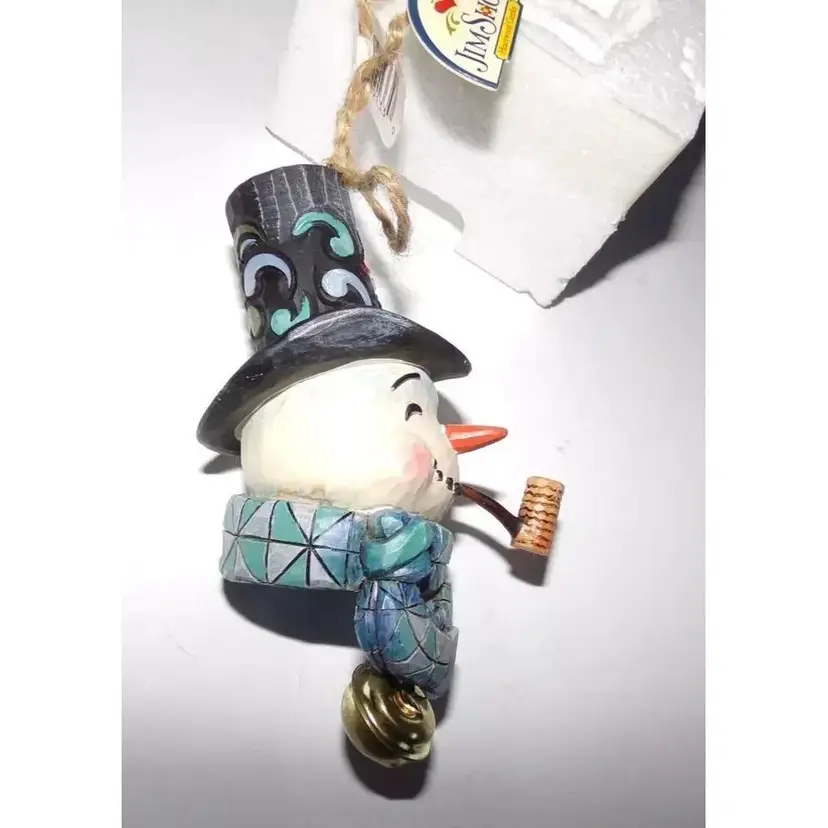 Dress up your Christmas tree with this beautiful Jim Shore Snowman Dangle Bell Ornament from the Heartwood Creek Collection. This 2010 piece is perfect for collectors and anyone who loves snowmen. Hang it anywhere in your home or office and enjoy the festive spirit it brings. Made by the renowned artist Jim Shore, this snowman ornament is a must-have for your collection. The intricate design, attention to detail, and vibrant colors make it stand out from other ornaments. It comes new in the box, ready to be gifted or added to your personal collection. Celebrate the season with this charming snowman ornament.