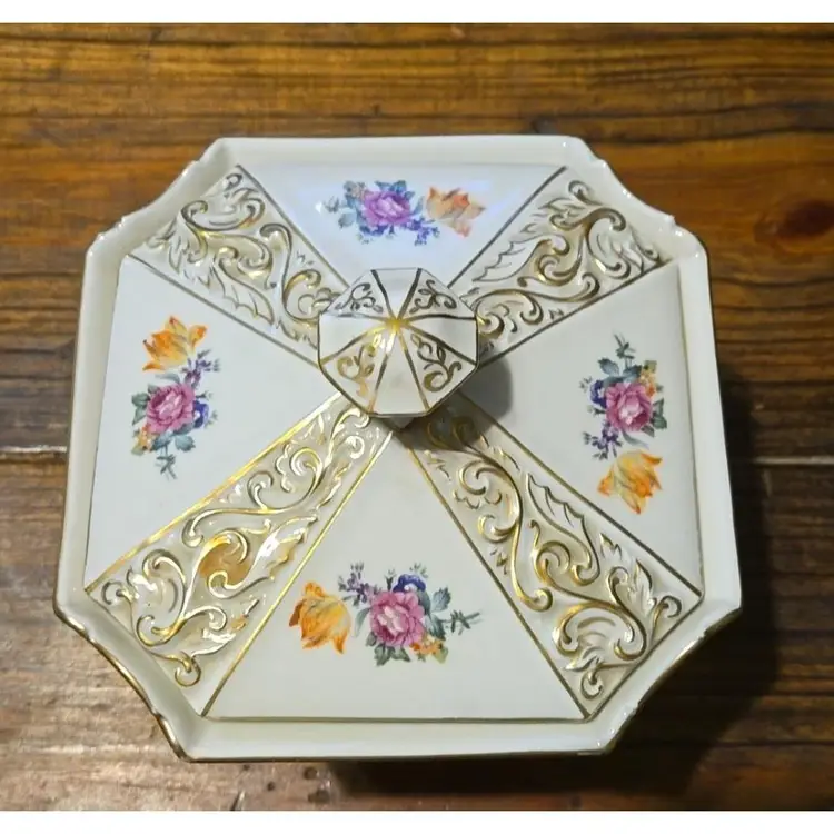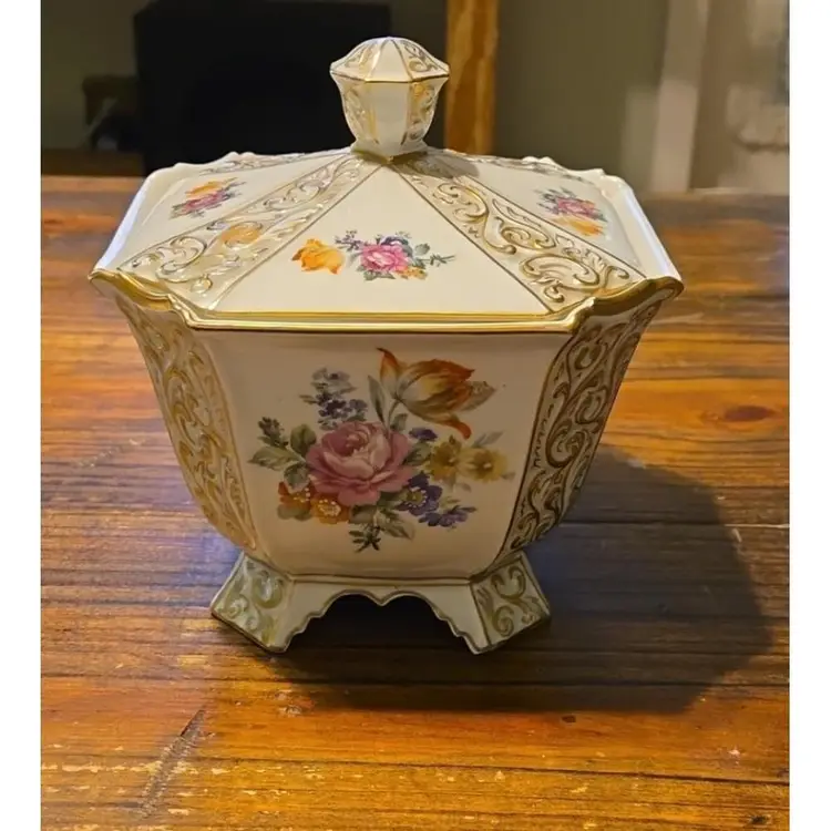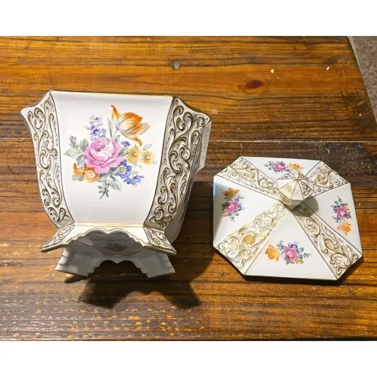 Beautiful German Lidded Box Jar Urn Gently preowned No chips or cracks Beautiful floral design About 7 inches tall