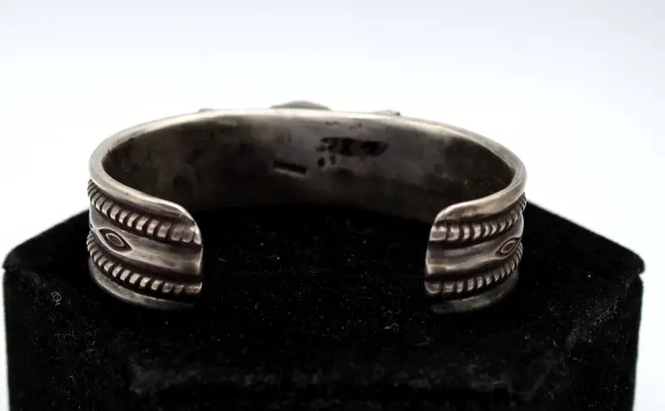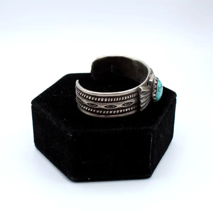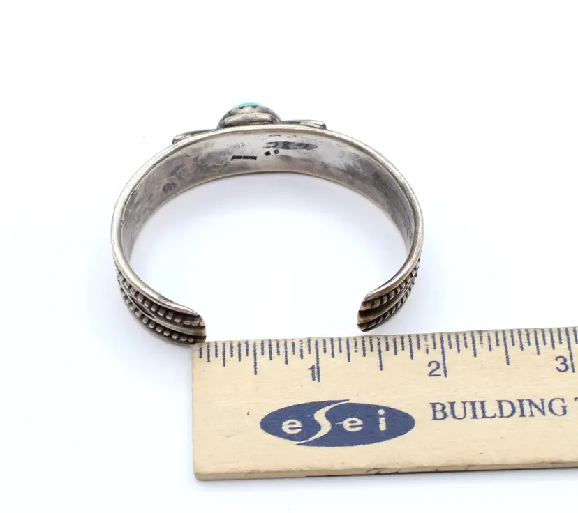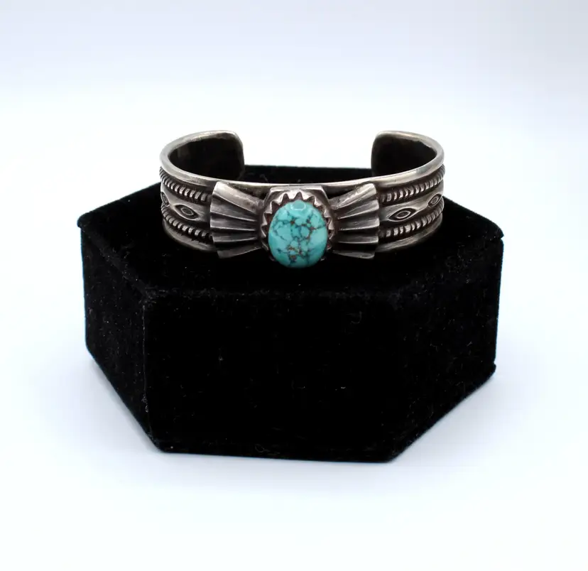 Fantastic signed JF Jock Favour (Anglo active 1970) bracelet. The beautiful matrix turquoise stone set in a hand cut bezel set on top of a fluted ribbon concho style and detail raised design work on the cuff. Inner diameter 5", gap 1.25", .75" wide.