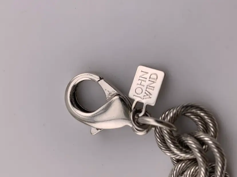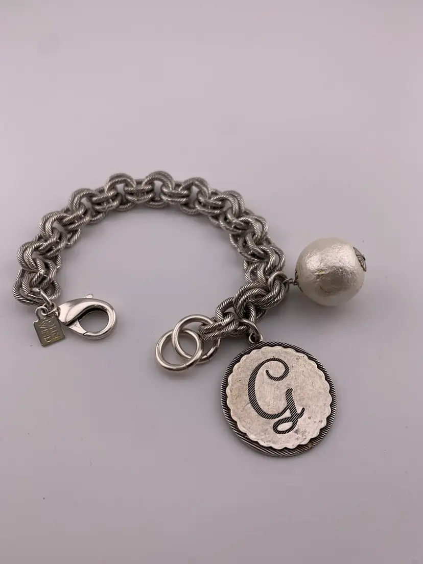 This John Wind silver tone bracelet is the Sorority Gal. Comes with a large marshmallow pearlish bobble and a large letter G charm that measures over and inch across. The bracelet can be latched at 7 3/4 or at 8 1/4. Because the link is large and double, this fits smaller than a regular bracelet with this length would. You could definitely remove either of the charms with needle nose pliers and could add your own if you want. This is in good used condition.